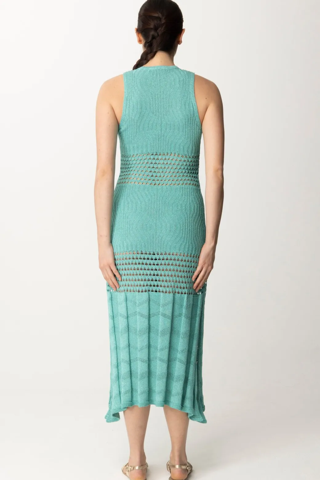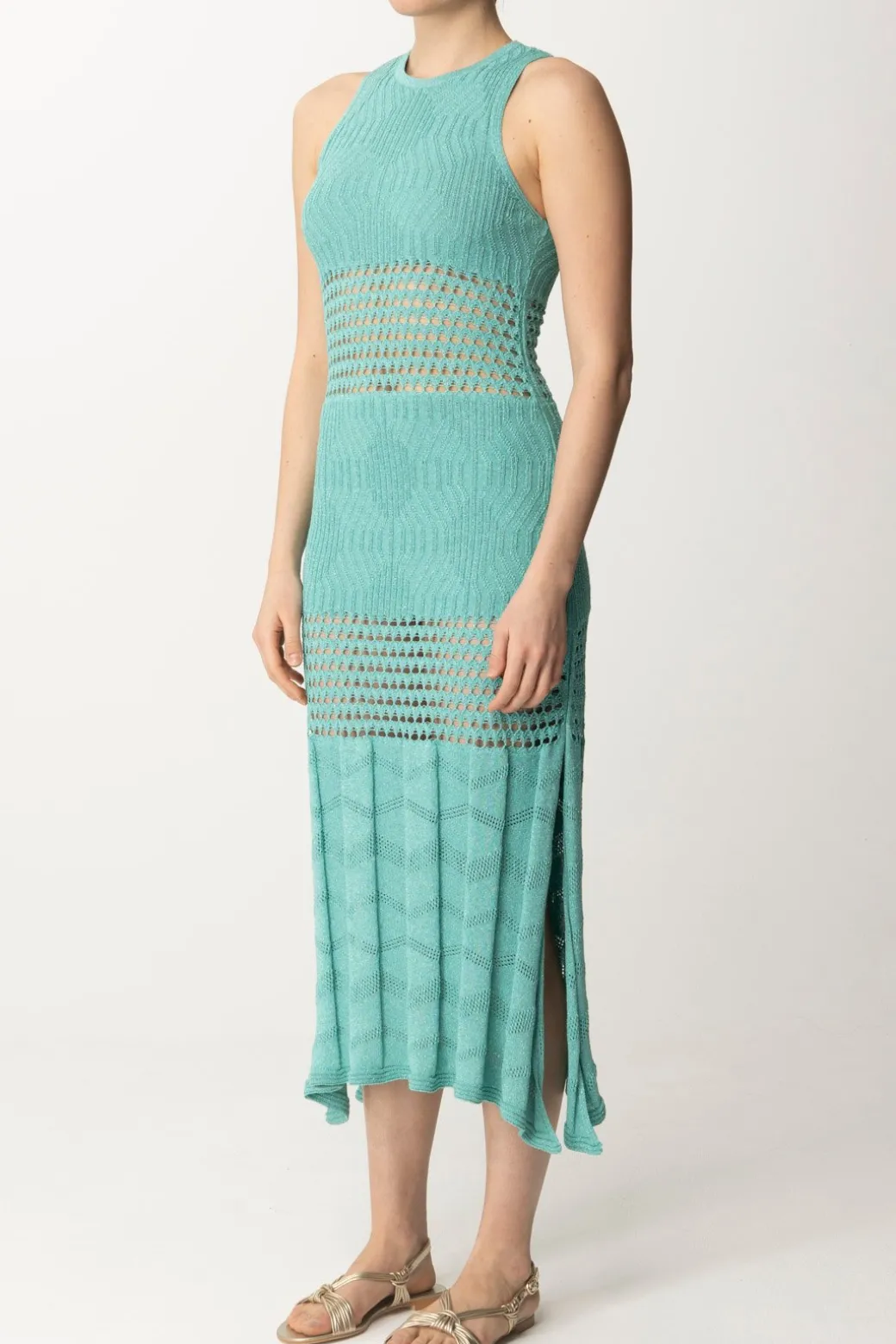 Con un paio di sandali flat è una mise vacanziera da giorno, ma con i giusti accessori diventa un intrigante outfit per la sera, illuminato dal lurex che trama la maglia di viscosa in cui è realizzato: un bellissimo abito Akep con inserti lavorati a crochet che creano delle finestre see-through luungo la bodyshape, completato da spacchi laterali che ne aumentano la già abbondante dose di femminilità. Abbinalo ad un long cardigan all’occorrenza: non ci sarà un look più charming di questo!