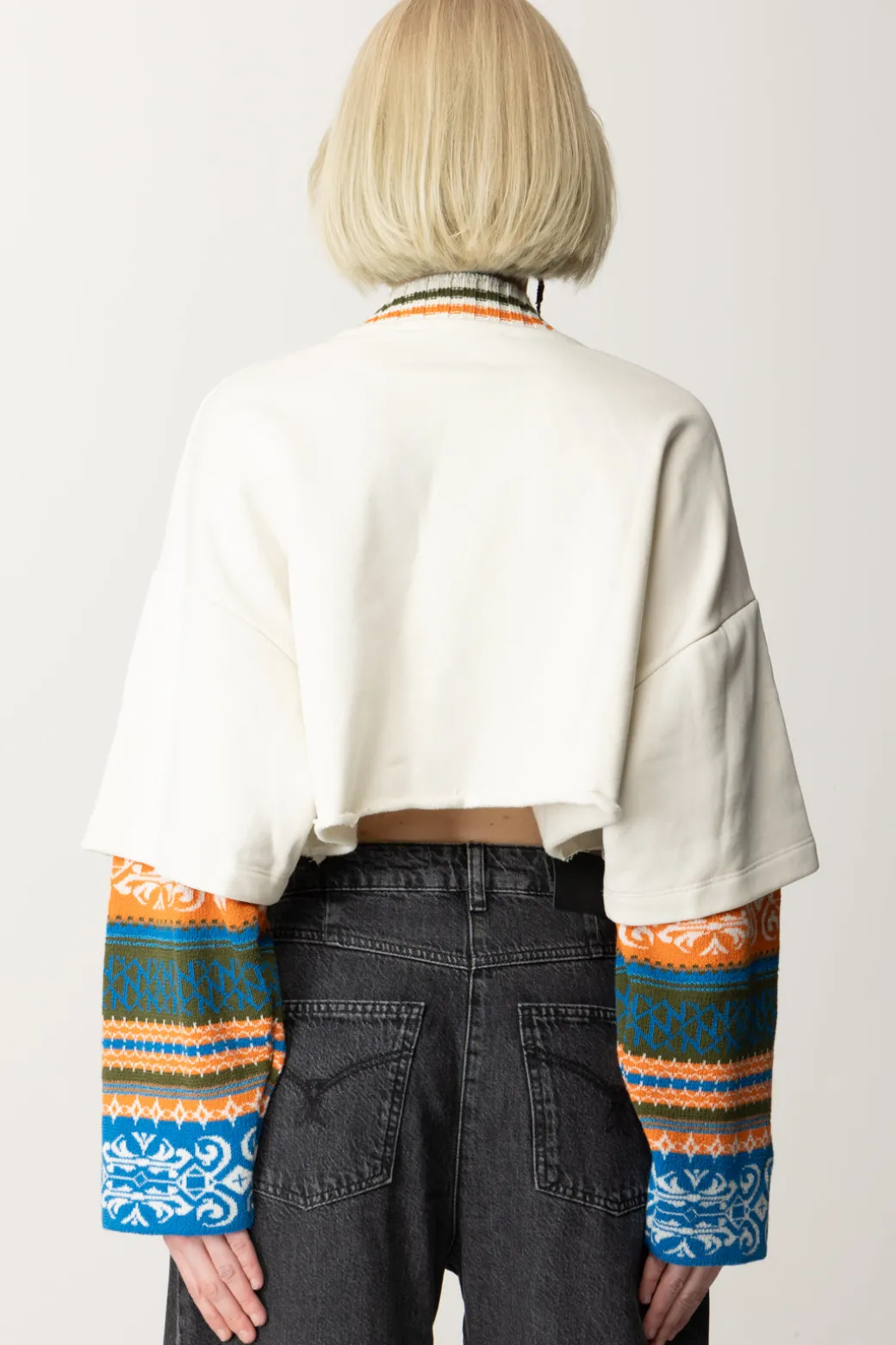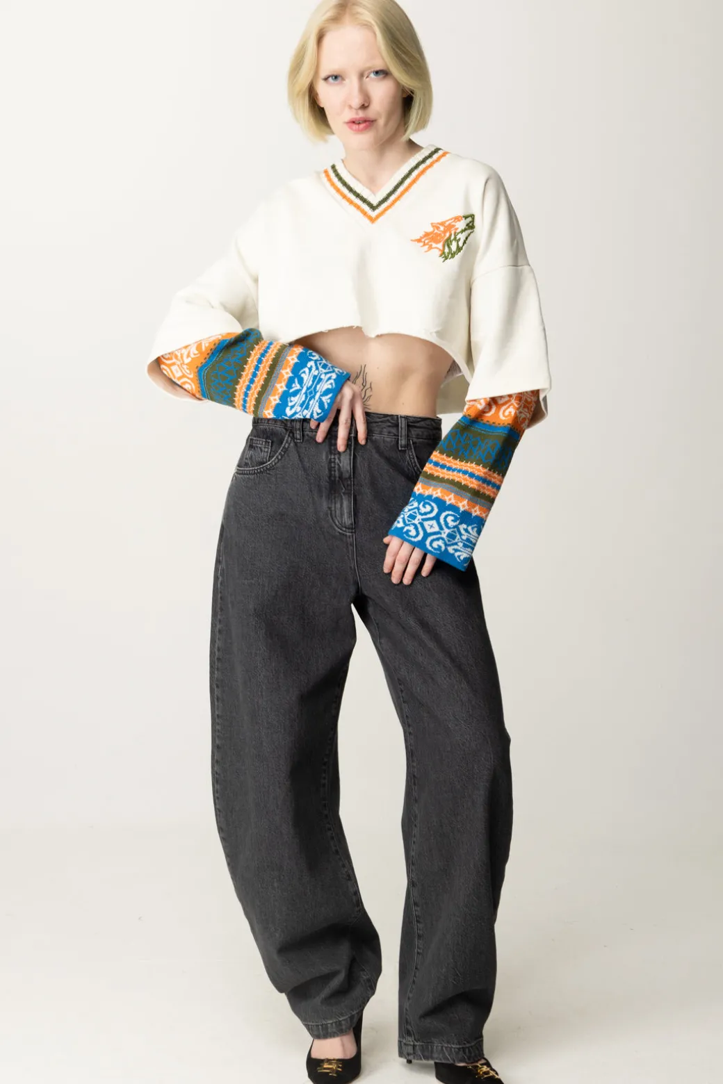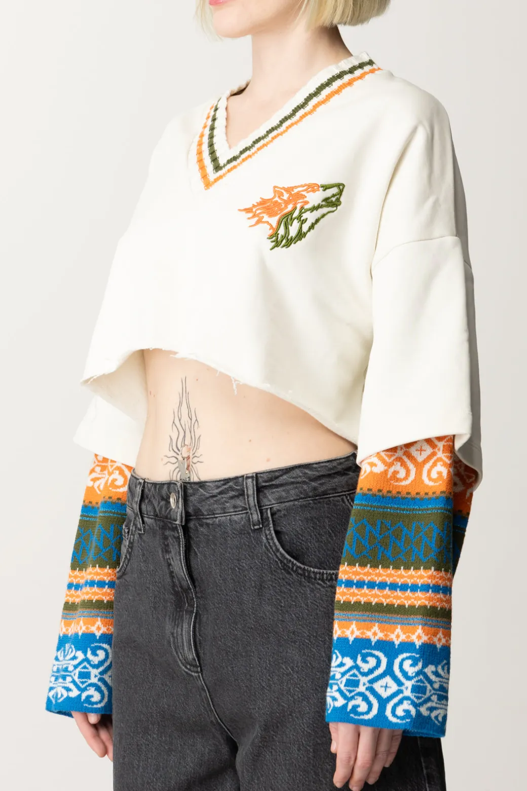 Colorato e originale, questo top spicca tra i suoi simili di stagione per la sua estrosità: una felpa Akep con in 100% cotone, caratterizzata da taglio crop con orlo a vivo e maniche lunghe con inserto jaquard a fantasia multitone. Un capo casual e rilassato nel fit ampio, con scollo a V a costine e ricamo sul petto a contrasto di colore, perfetto da combinare con i suoi bottom a vita alta più sporty, come denim, joggers e leggings.