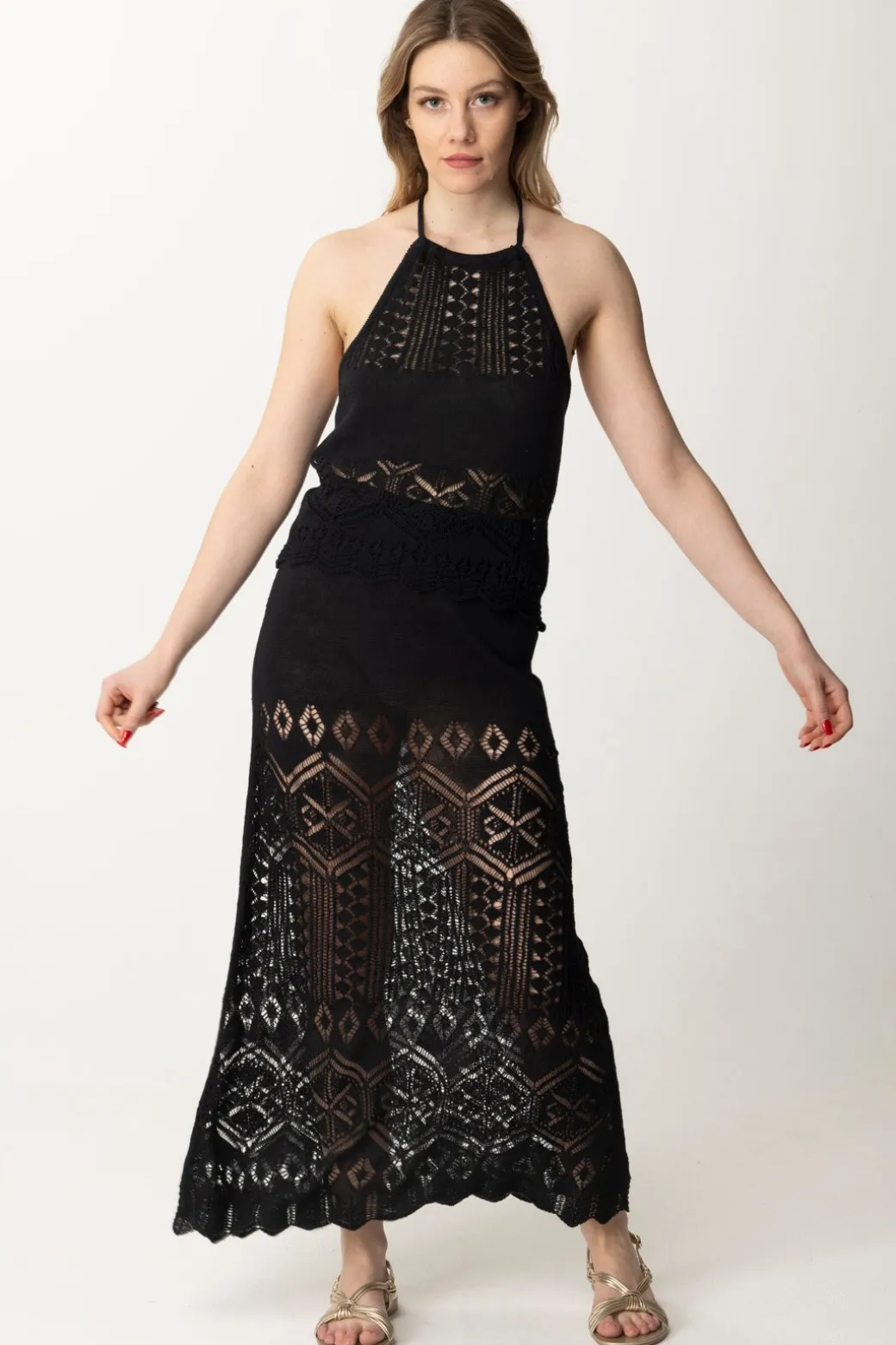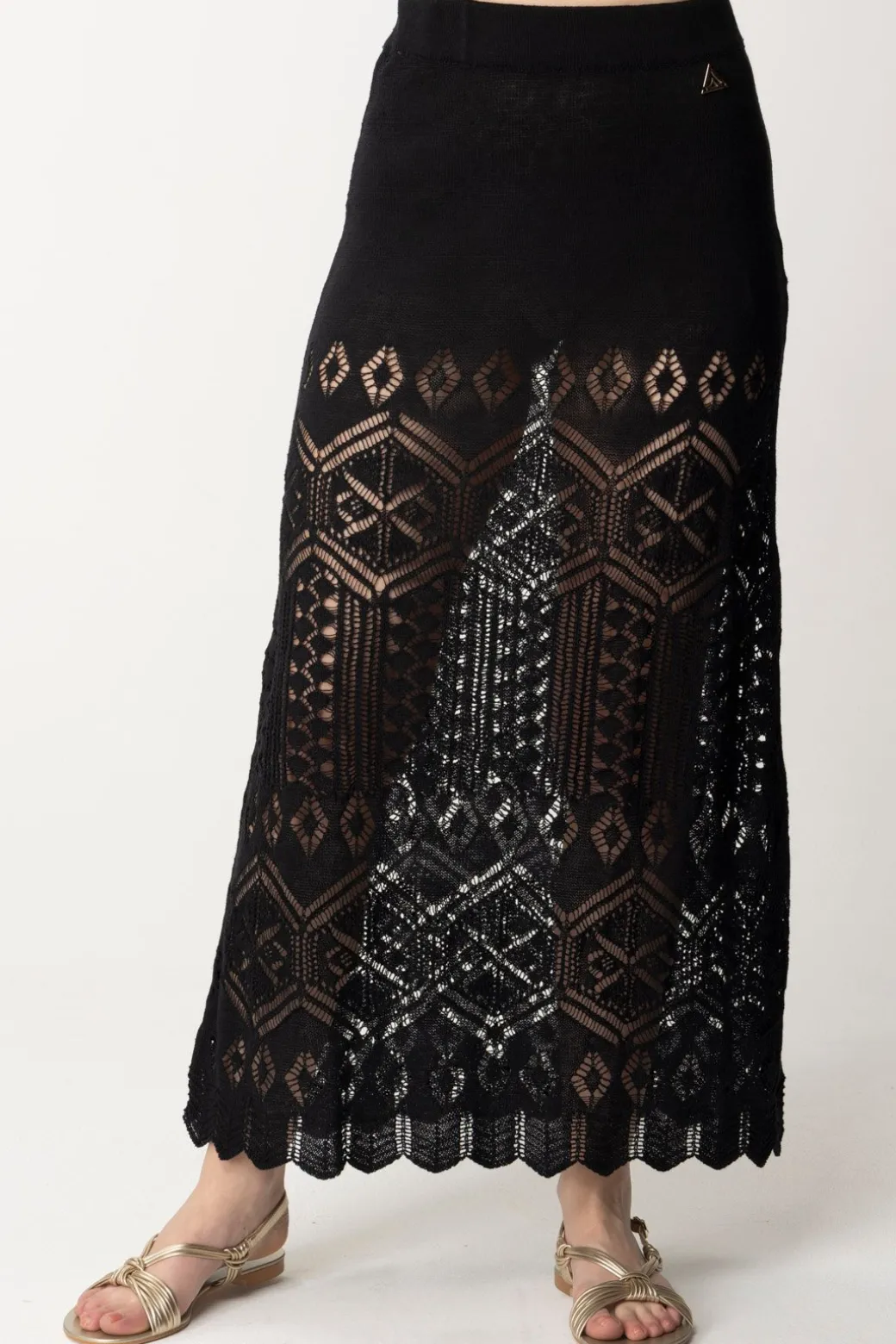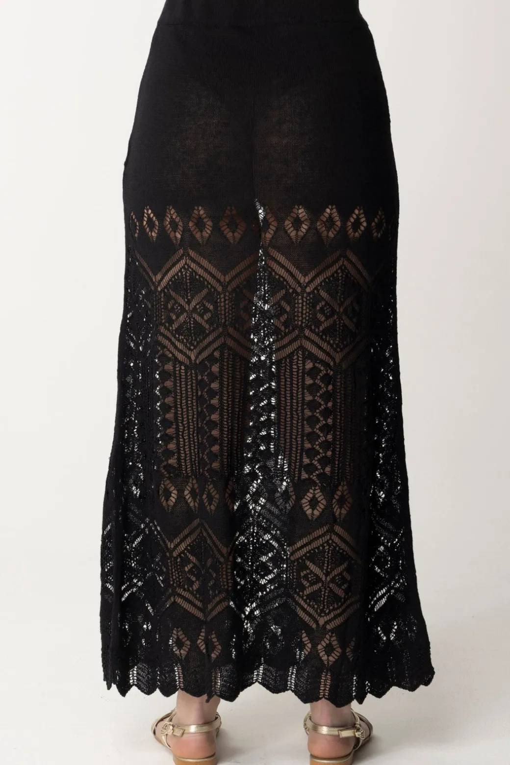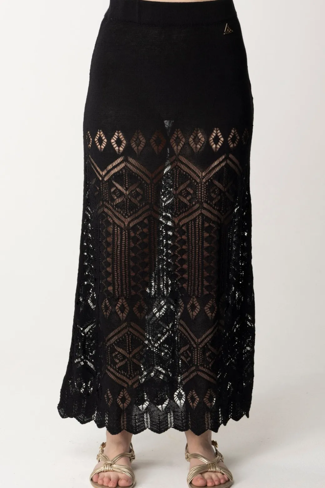 Bellissima gonna Akep in maglia di lino, con una elegante lavorazione traforata che ne segue la lunghezza, fino all’orlo smerlato. Vita alta, sarà bellissima da indossare con crop top per la sera, ma anche in abbinamento ai tuoi bikini e onepiece indossandola come un copricostume pret-a-porter.