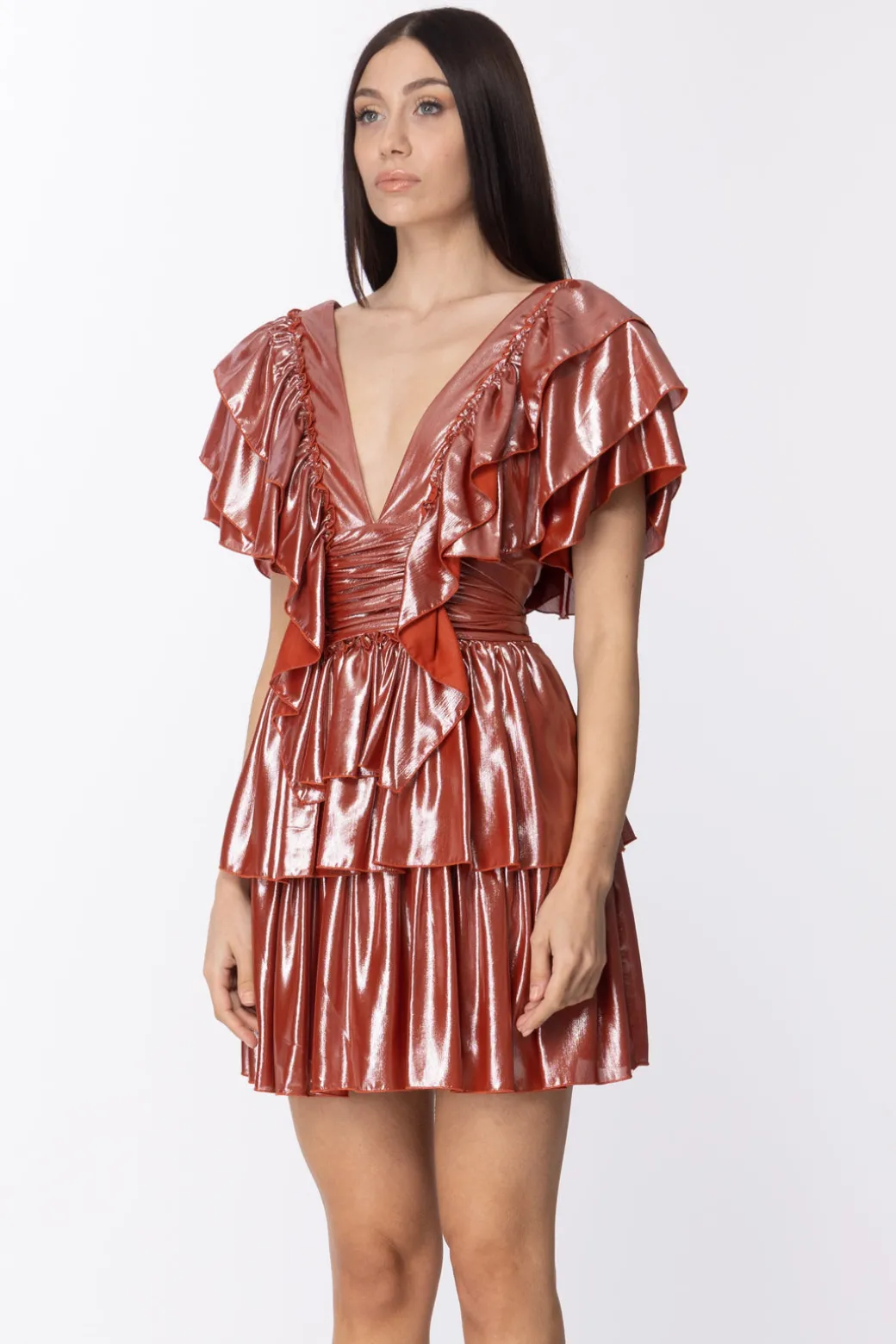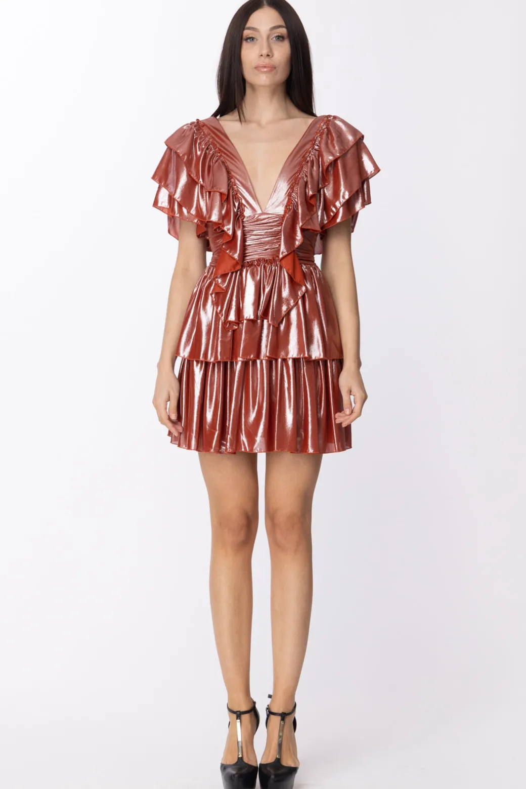 L’abito adatto per sentirti protagonista! Luminoso e ricco di rouches che lo abbelliscono, tutto firmato Aniye By. Un mini abito realizzato in tessuto fluido, con scollo a v frontale e su retro e con balze sulla gonna che donano stile. Da indossare con sandali alti per slanciare la figura e accessori luminosi.
