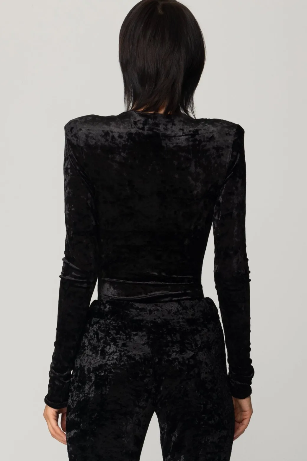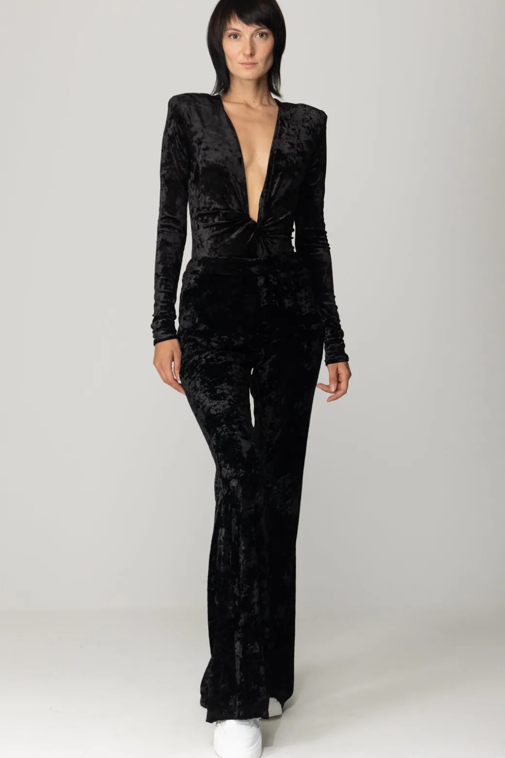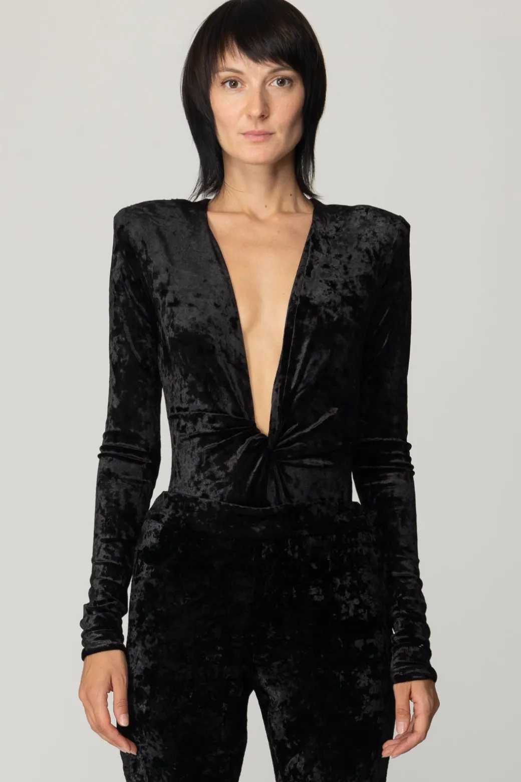 Body Aniyeby realizzato in velluto, dal fit aderente e un profondo scollo a V con nodo sul fondo. Eleganza effortless per un look da sera dinamico e sofisticato.