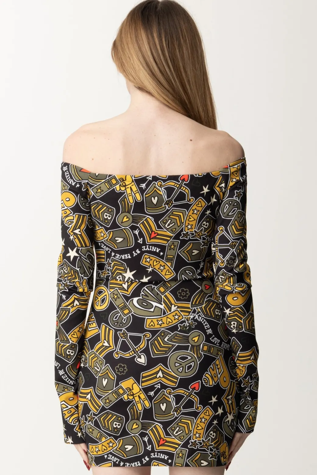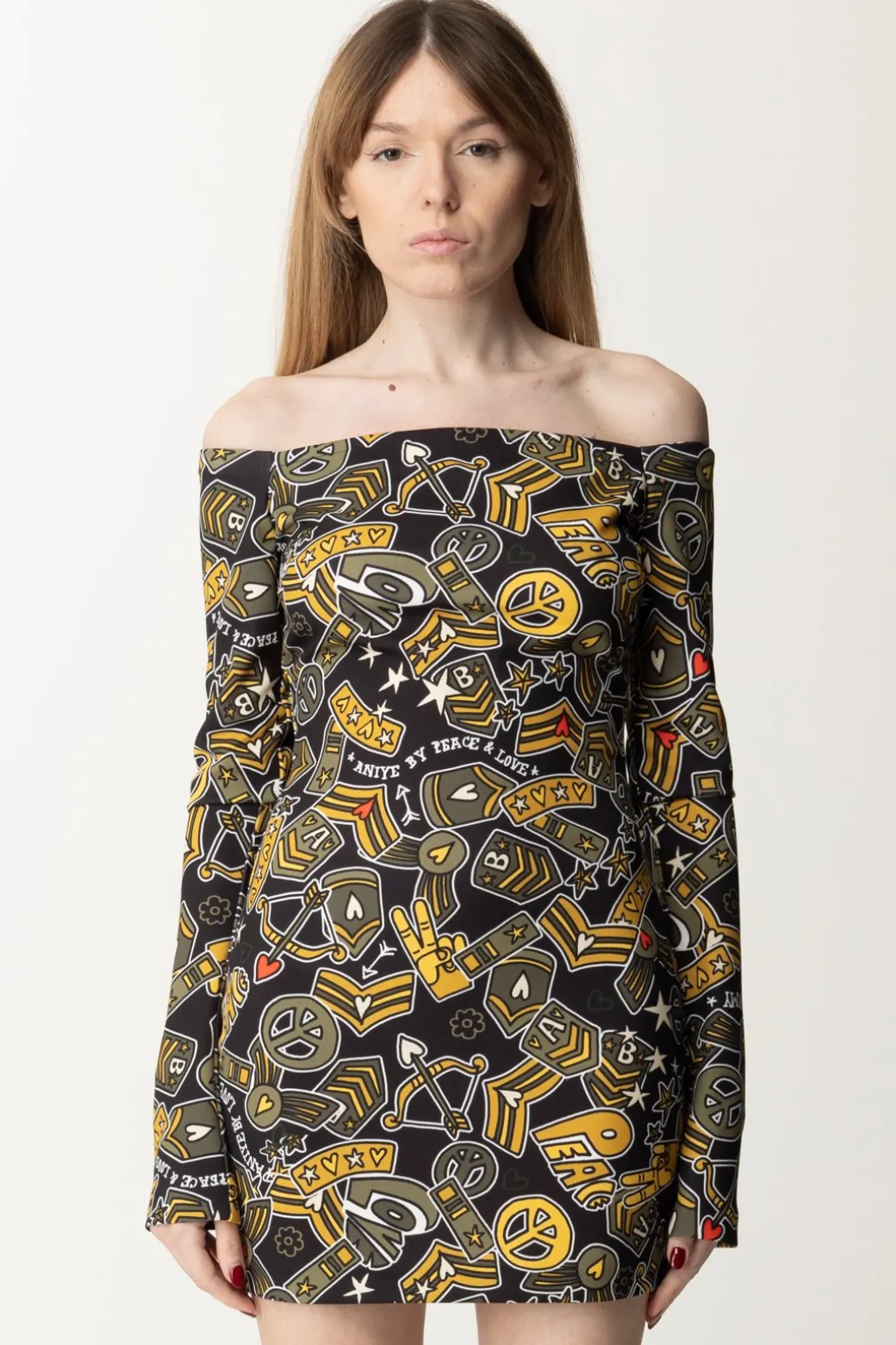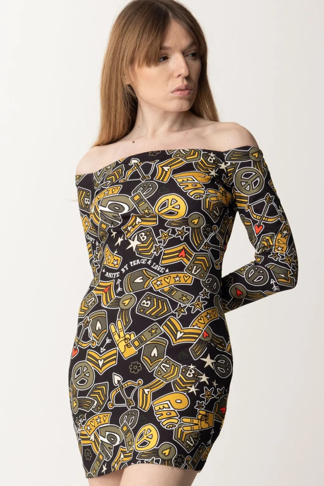 Ogni stagione questo brand ti sorprende con le sue stampe, e questa proposta non è da meno: un pattern estremamente pop che mette insieme diversi elementi vintage è la caratteristica di questo abito Aniye By, con il suo fit a tubino e le maniche lunghe con scollo off shoulder. I tuoi party stanno per fare un importantissima acquisizione: questo abito qui!