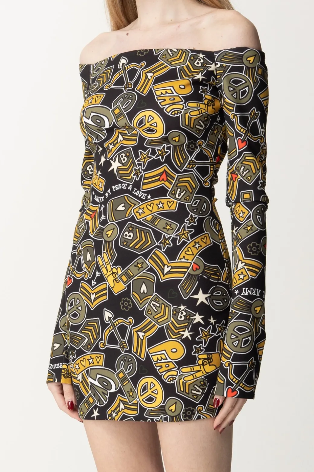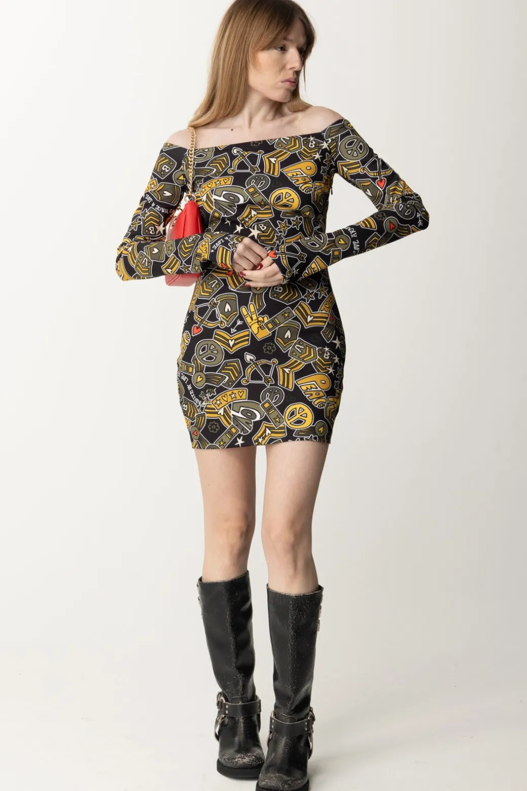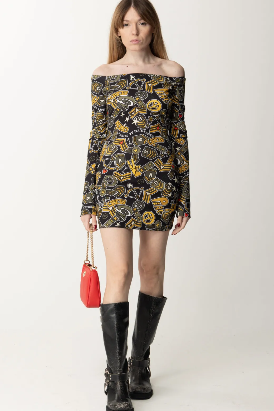 Ogni stagione questo brand ti sorprende con le sue stampe, e questa proposta non è da meno: un pattern estremamente pop che mette insieme diversi elementi vintage è la caratteristica di questo abito Aniye By, con il suo fit a tubino e le maniche lunghe con scollo off shoulder. I tuoi party stanno per fare un importantissima acquisizione: questo abito qui!
