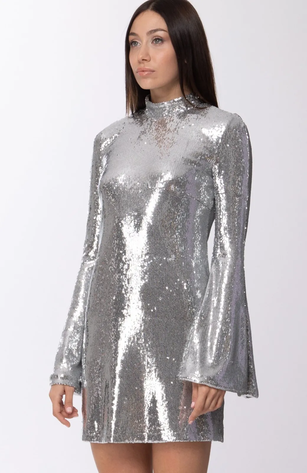 Mini abito in paillettes Aniye by pronto a farti brillare semplicemente indossandolo! Pensato per i party look più glamour, ha ilcollo alto e le maniche a campana, con un fit slim che cade morbido e leggermente svasato sulla silhouette.