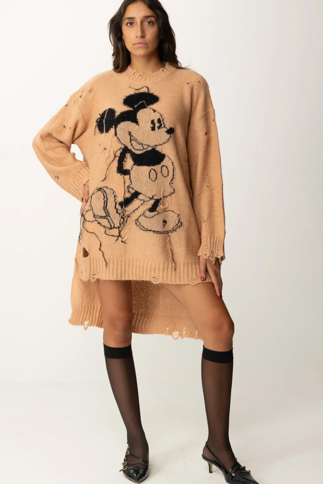 Questo mini abito Aniyeby è realizzato in mohair d’alpaca e si distingue per il fondo asimmetrico e il disegno ad intarsio Cartoon Mickey arricchito da fili fluttuanti. Le rotture e sfrangiature aggiungono un tocco di grinta a questo capo caldo e morbido, perfetto per esprimere uno stile giocoso ma ricercato.