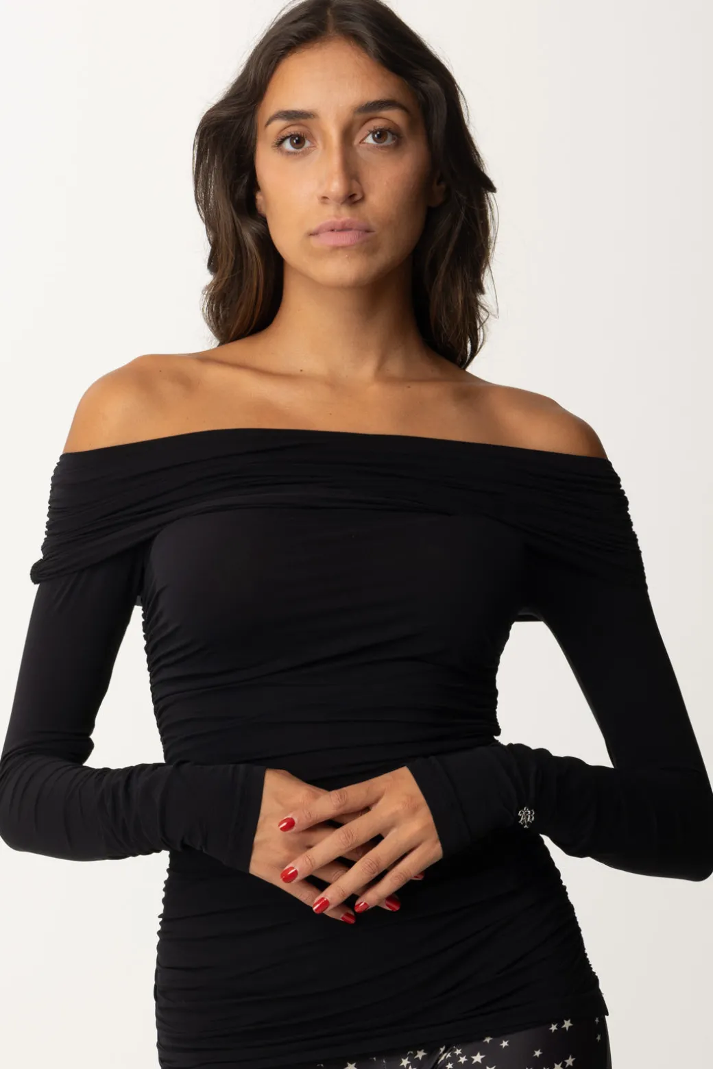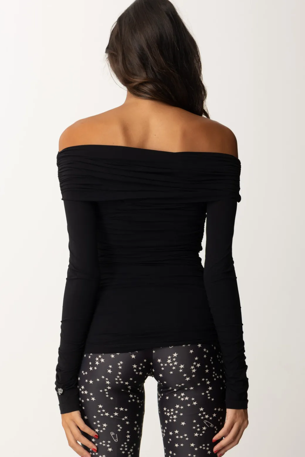 Un capo dal design unico, questo top Aniyeby in jersey presenta maniche lunghe e spalle scoperte, con uno scollo ripiegato sul seno che conferisce un tocco sofisticato. Le maniche particolarmente lunghe aggiungono personalità e stile.Perfetto con pantaloni a vita alta per un look chic e contemporaneo, o con una gonna a tubino per un outfit elegante.