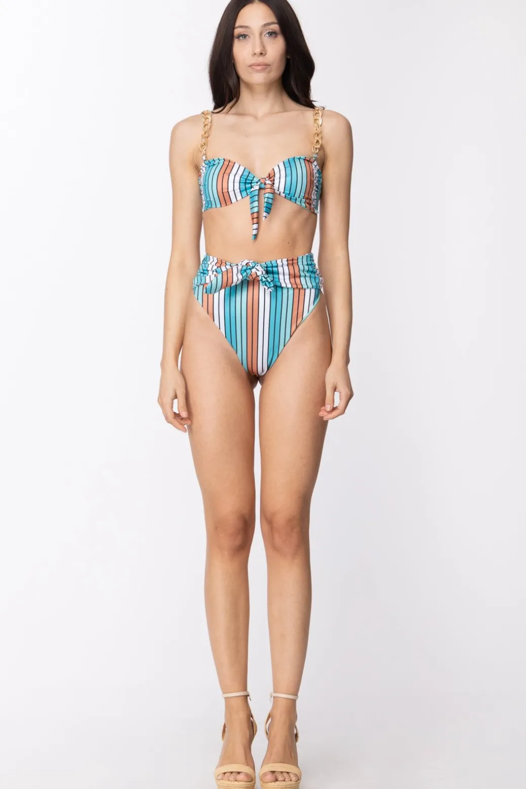 Quanto colore in questo bikini Ardoel con fantasia a righe! E non solo: il nodo al seno e la vita alta dello slip gli danno un’aria un po’ pin-up, mentre le catene dorate che sostituiscono le bretelle aggiungono un eye-catchy scintillio al sole. Femminile e allegro, il compromesso perfetto.