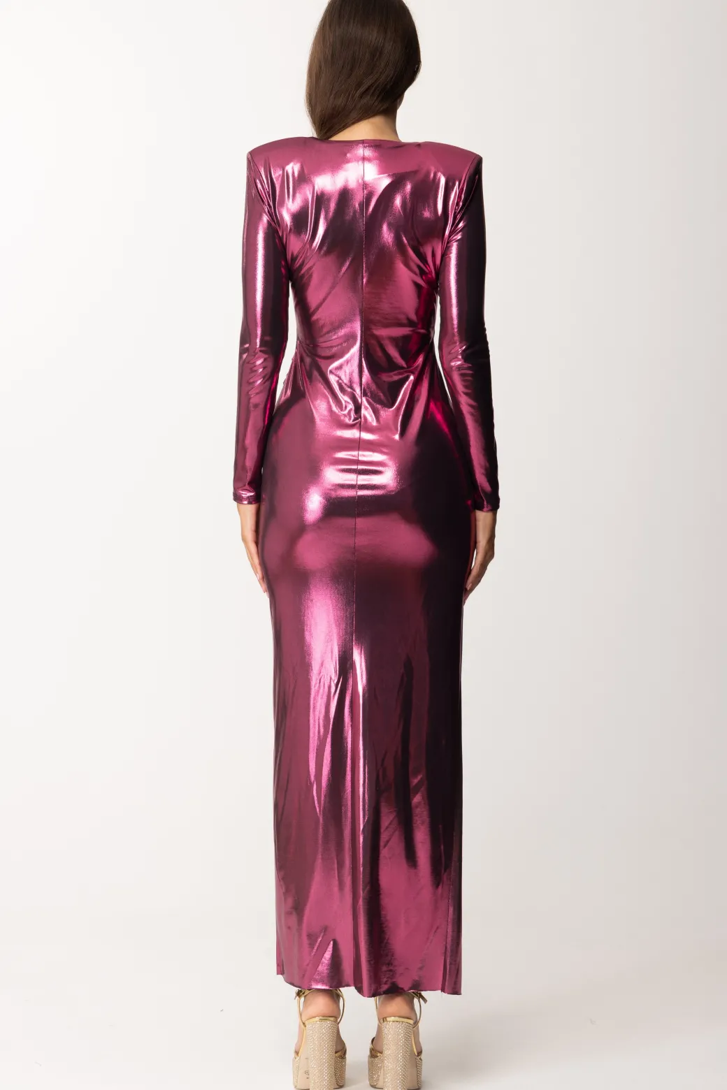 Un abito firmato Dramèe in tessuto laminato lucido, con spacco quasi centrale, scollatura a V con accessorio catena. Una mise sensuale con un tocco lussuoso e ricercato al tempo stesso.