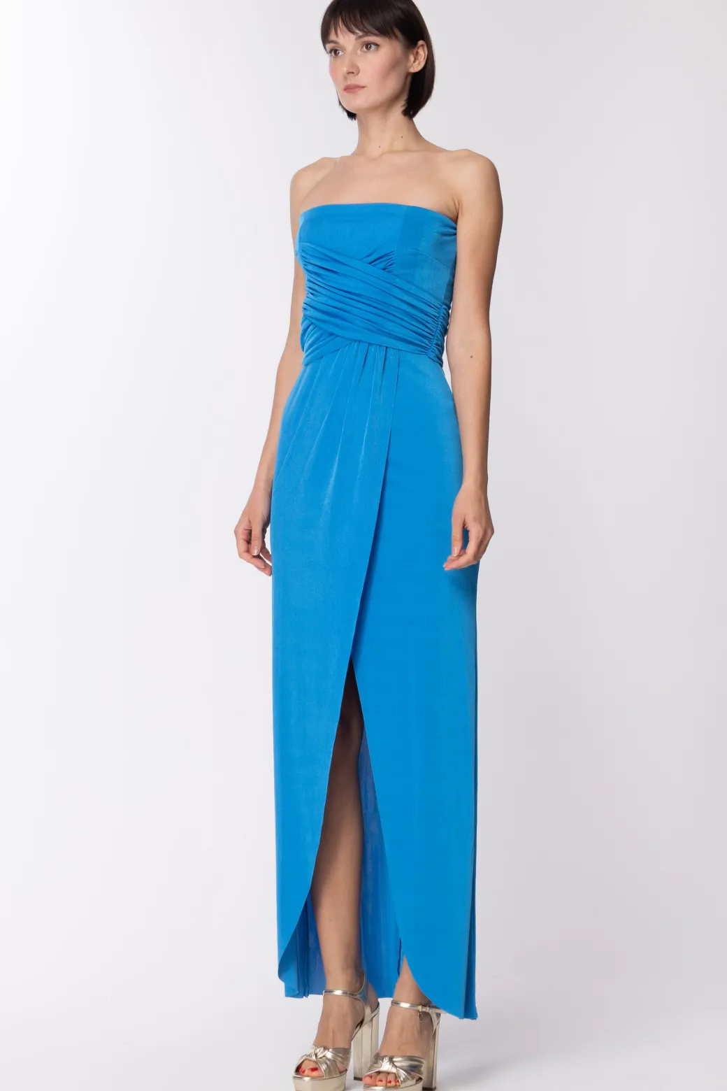 Fresco ed elegante per un evento estivo: abito Dramèe con un bel top a scollo dritto con drapeggio a incrocio che avvolge il seno, combinato ad una gonna a tulipano con un ampio spacco frontale. Perfetto con sandali gold ma anche con le nuance del rosa. E tu, con cosa lo abbineresti?