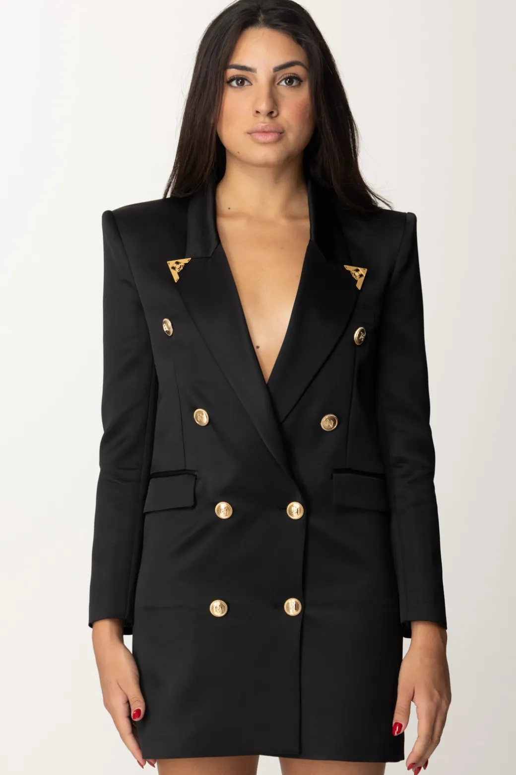 L’abito robe manteau Elisabetta Franchi realizzato in fresco lana effetto lucido, è un capo sofisticato e di tendenza, perfetto per occasioni formali. Impreziosito sui revers da puntali logati che richiamano la luce dei bottoni. Completa l’outfit con décolleté e una borsa a mano.