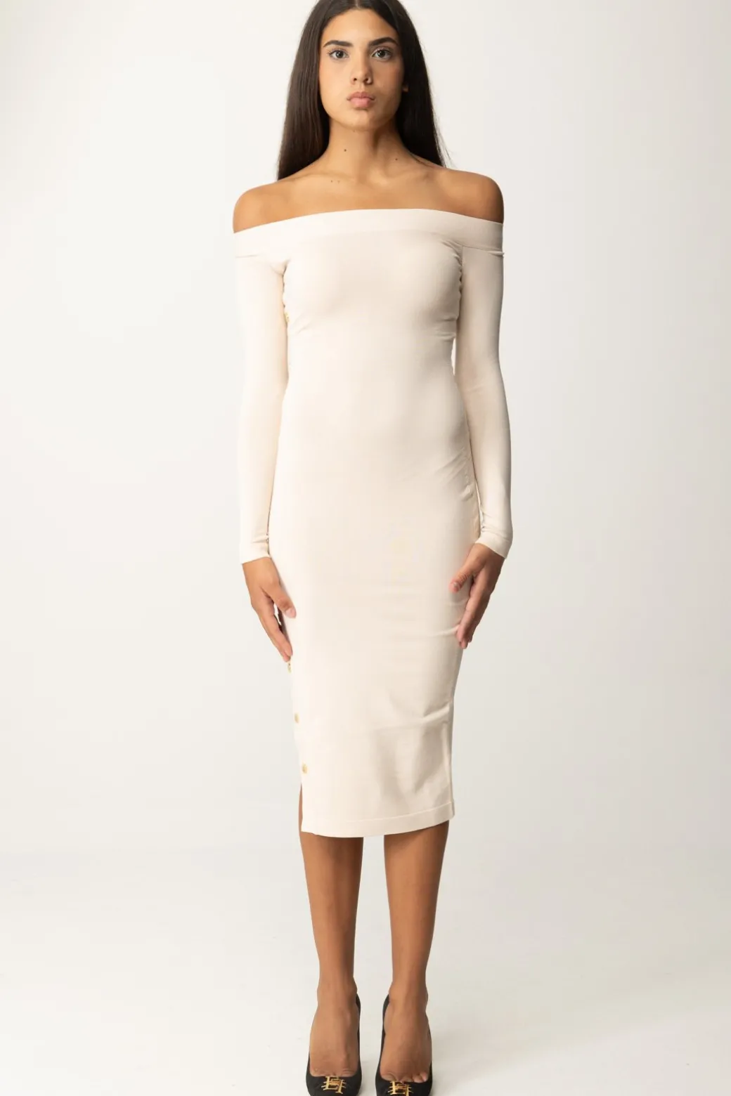 Sofisticato nella sua semplicità: questo abito in viscosa Elisabetta Franchi svetta in femminilità grazie allo spacco laterale aperto da bottoncini smaltati e alla scollatura off-shoulder, che aggiungono charme all’aderenza perfetta tipica del tessuto in maglia. Un design a tubino che sarà perfetto completato da un bel tacco, per una perfetta allure ladylike.