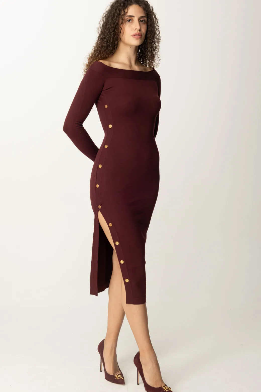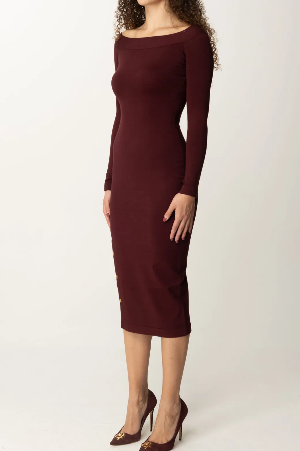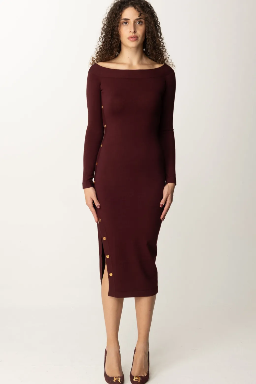 Sofisticato nella sua semplicità: questo abito in viscosa Elisabetta Franchi svetta in femminilità grazie allo spacco laterale aperto da bottoncini smaltati e alla scollatura off-shoulder, che aggiungono charme all’aderenza perfetta tipica del tessuto in maglia. Un design a tubino che sarà perfetto completato da un bel tacco, per una perfetta allure ladylike.