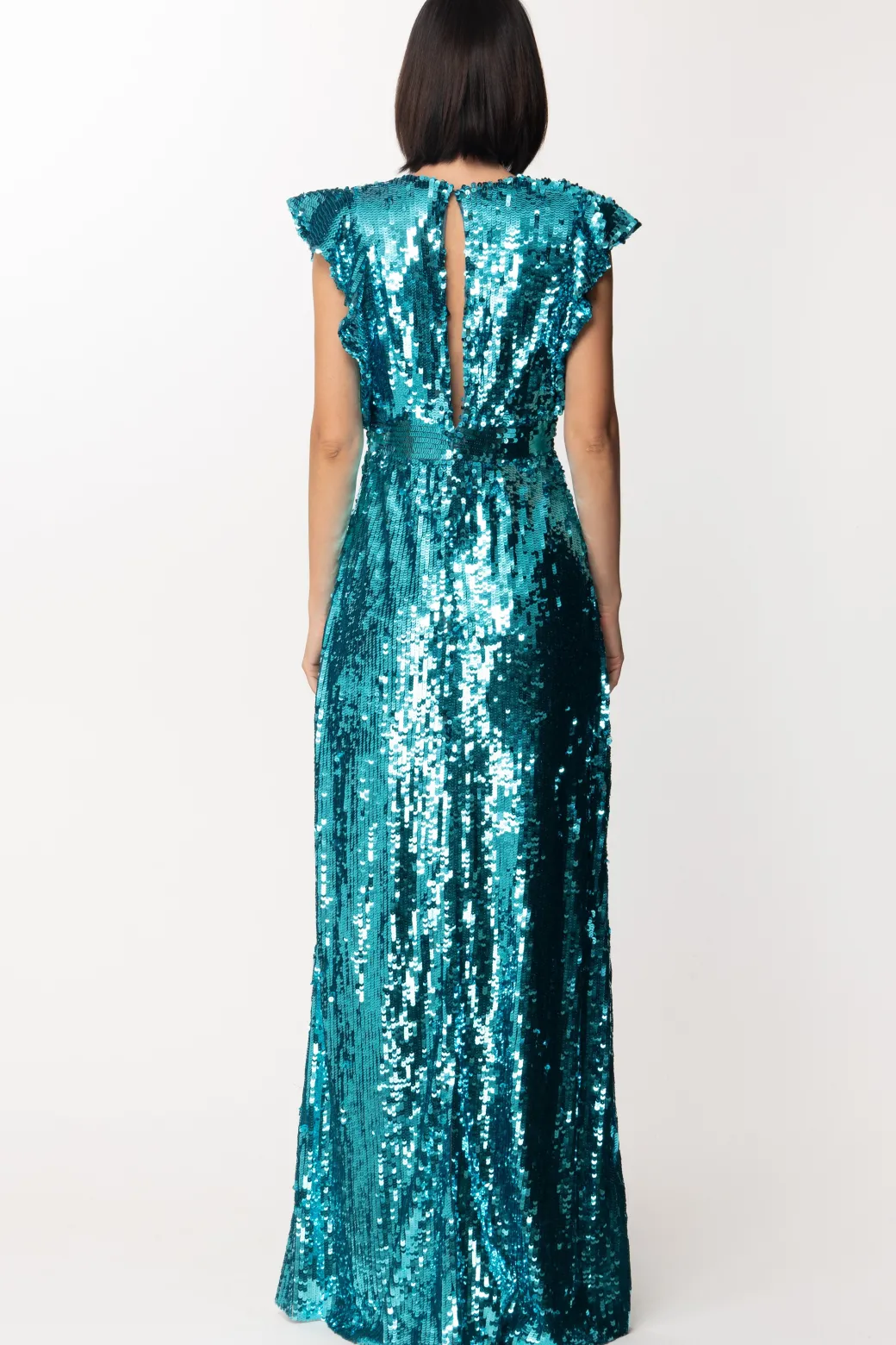 Le paillettes e gli abiti lunghi sono la combinazione perfetta per la grand soirée! Ed è proprio l’occasione in cui indossare questo abito lungo Elisabetta Franchi, dalle forme gentili e romantiche. Taglio sotto al seno, ampiamente evidenzato dallo scollo a v, e maniche appena accennate dalla presenza di volant. Sul retro, invece, un delicato scollo a goccia.