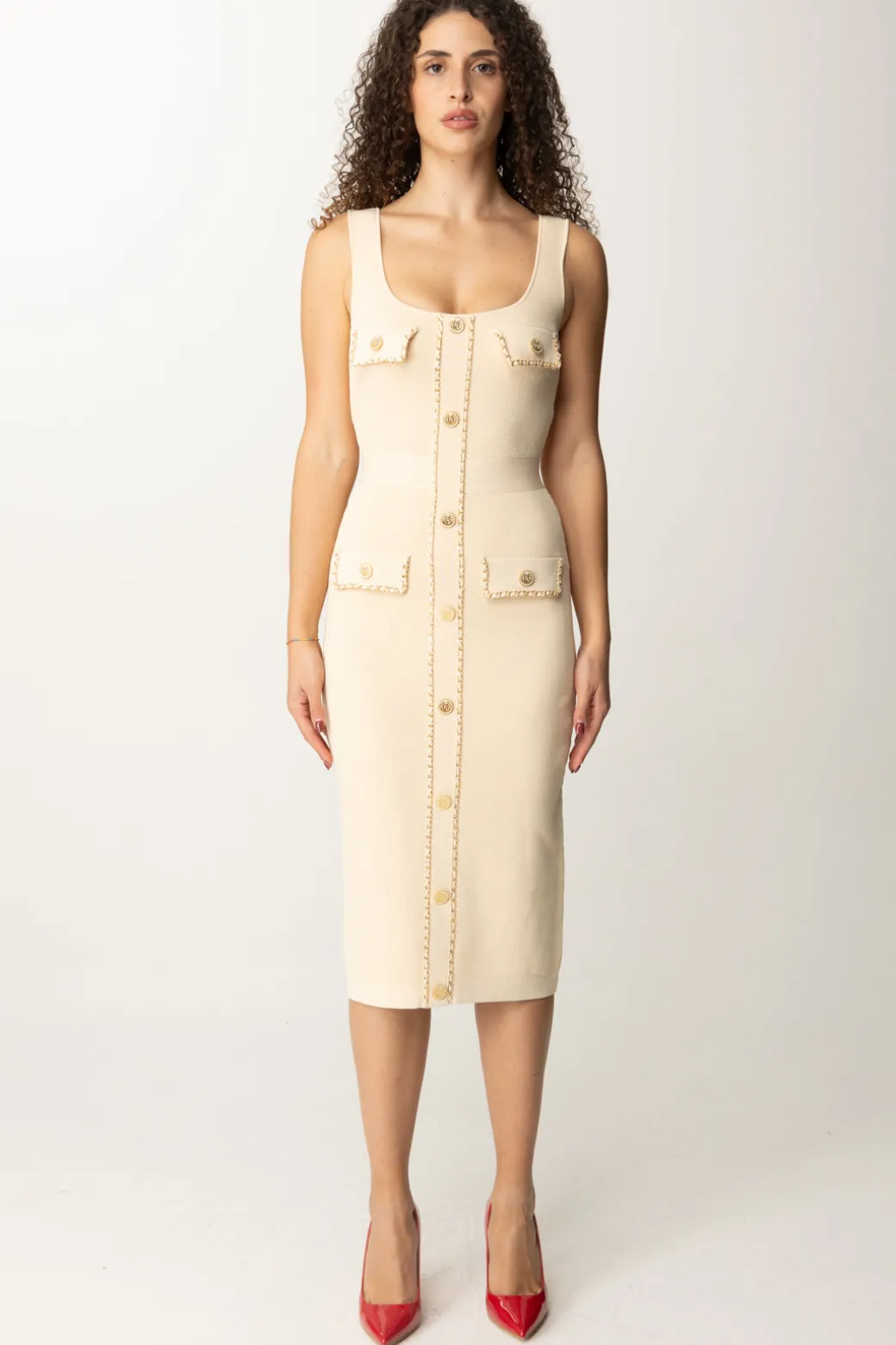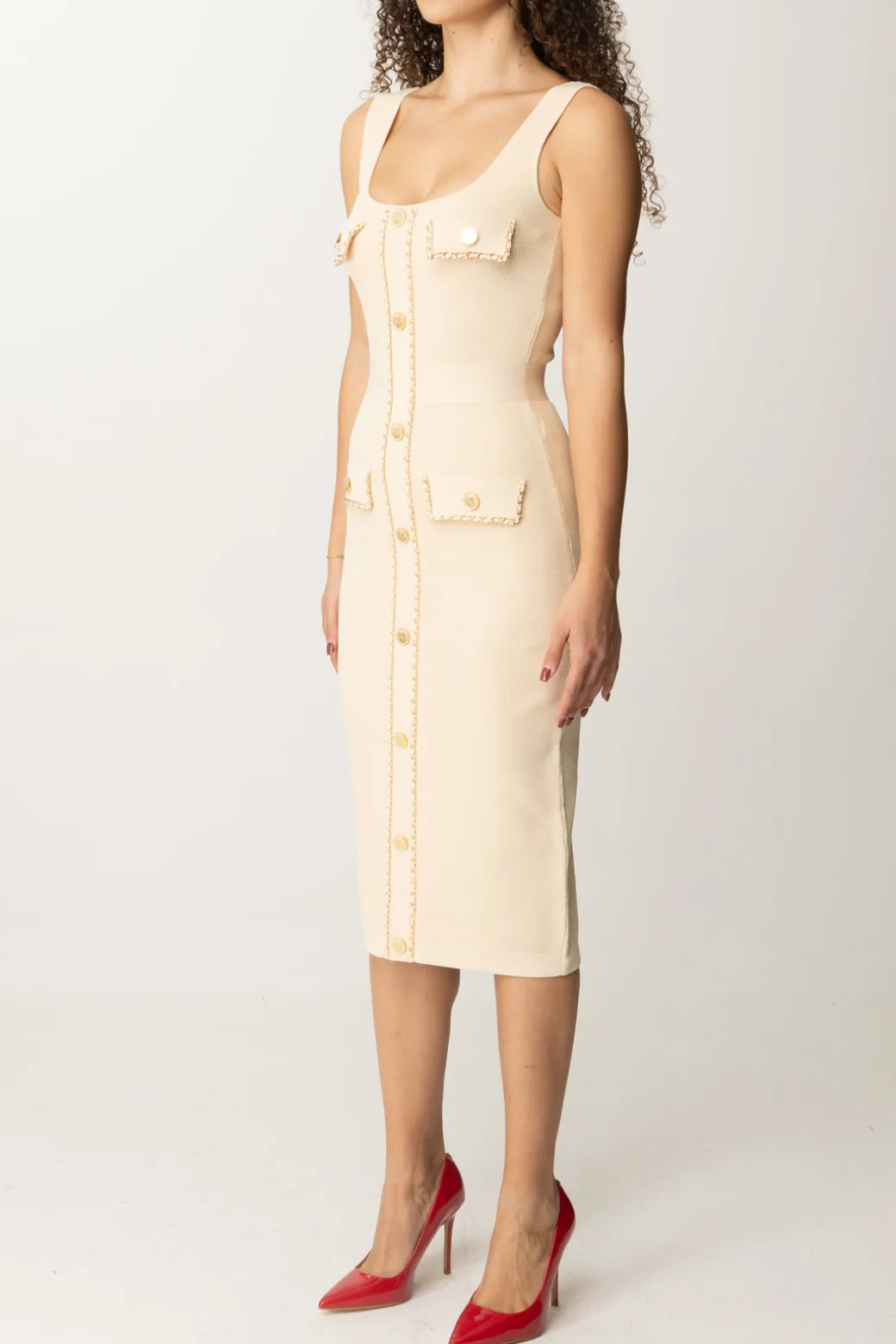 Elegante abito Elisabetta Franchi realizzato in viscosa punto nido d’ape, dal fit aderente con tasche frontali e bottoni decorativi in oro. Un abito ideale per un look sofisticato e senza tempo. Perfetto per occasioni formali o cene raffinate, da abbinare a tacchi alti e clutch per un effetto chic e raffinato.