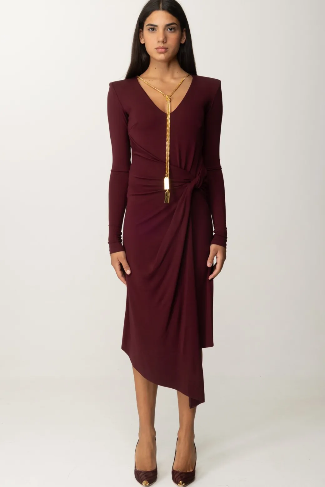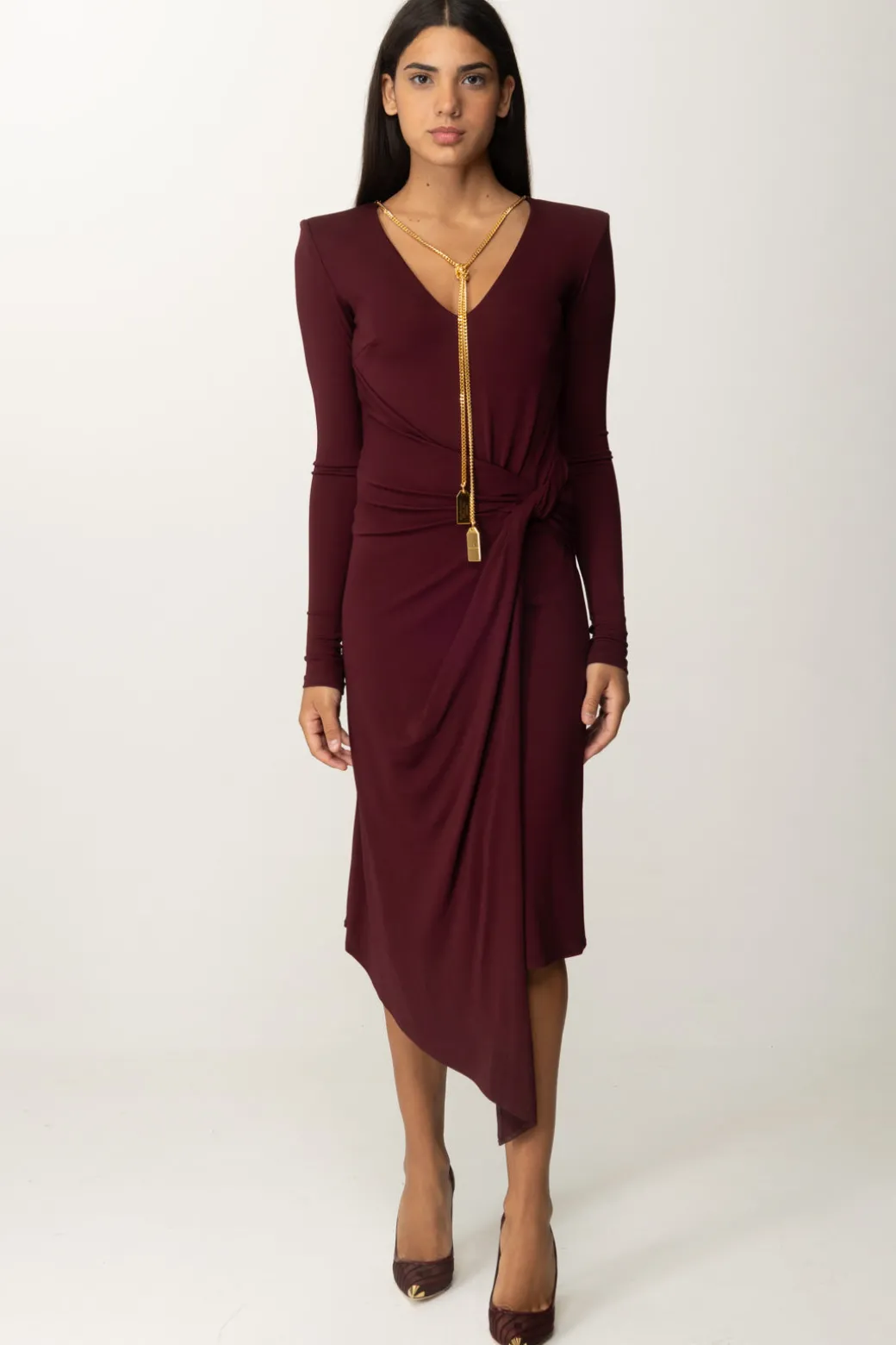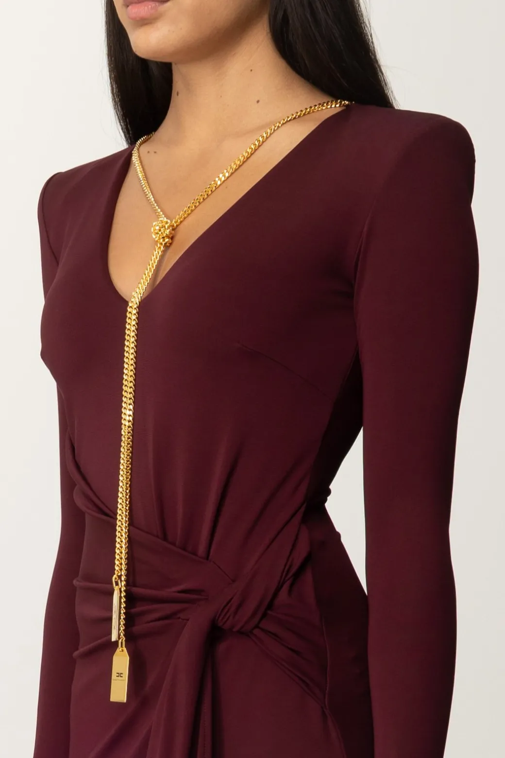 Una mise elegante e versatile, che potrai indossare from day to night con i giusti accessori. Non farti scappare questoabito Elisabetta Franchi dal taglio midi animato dall’asimmetria del fondo, data dal nodo al fianco che genera anche un morbido drappeggio sui fianchi. Scollatura profonda, è completato dalla presenza di un accessorio a collana tipico della collezione, in oro, con pendenti logati, che potrai rimuovere all’occorrenza per rendere il tuo look più sobrio o aggiungere il bijoux che preferisci.