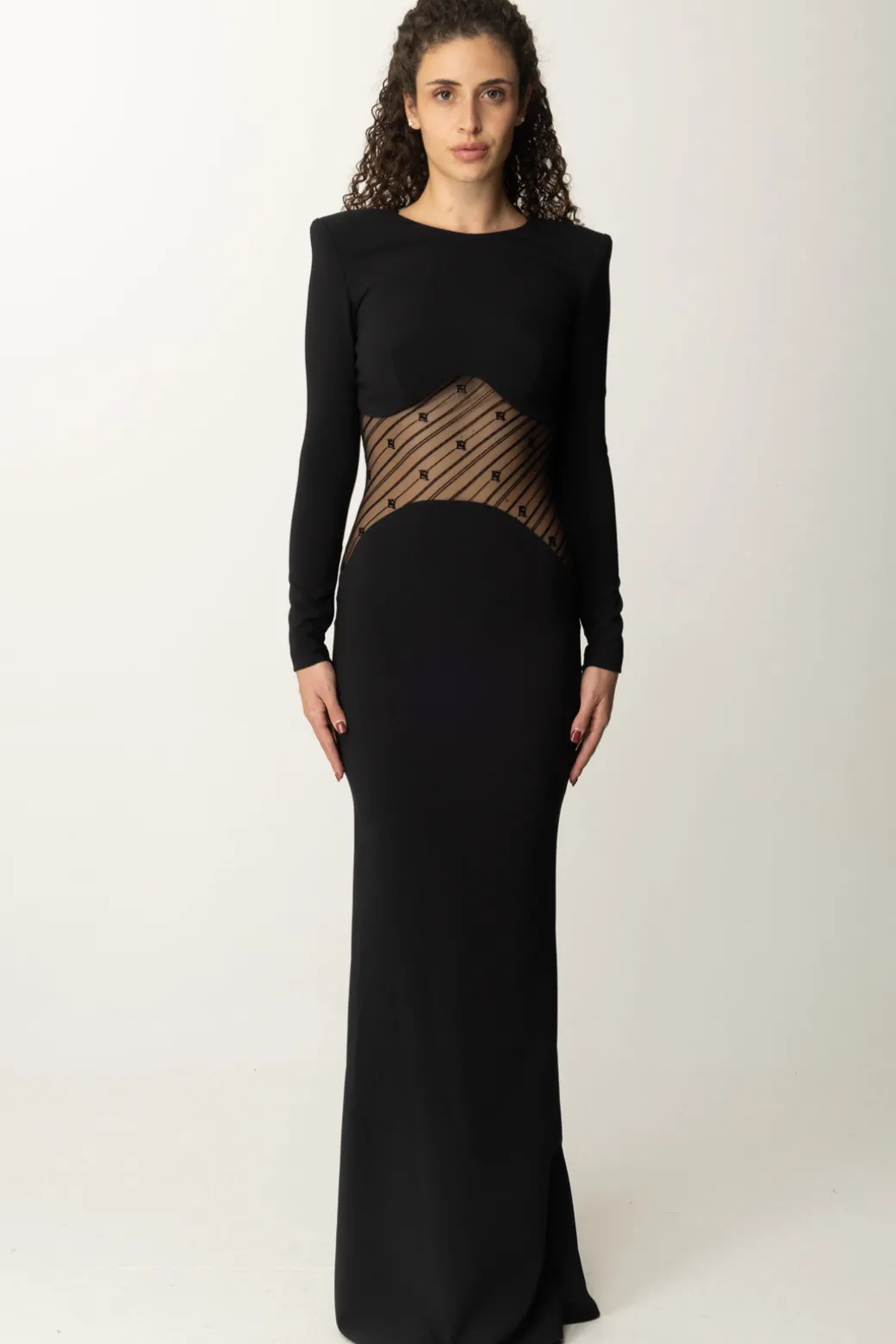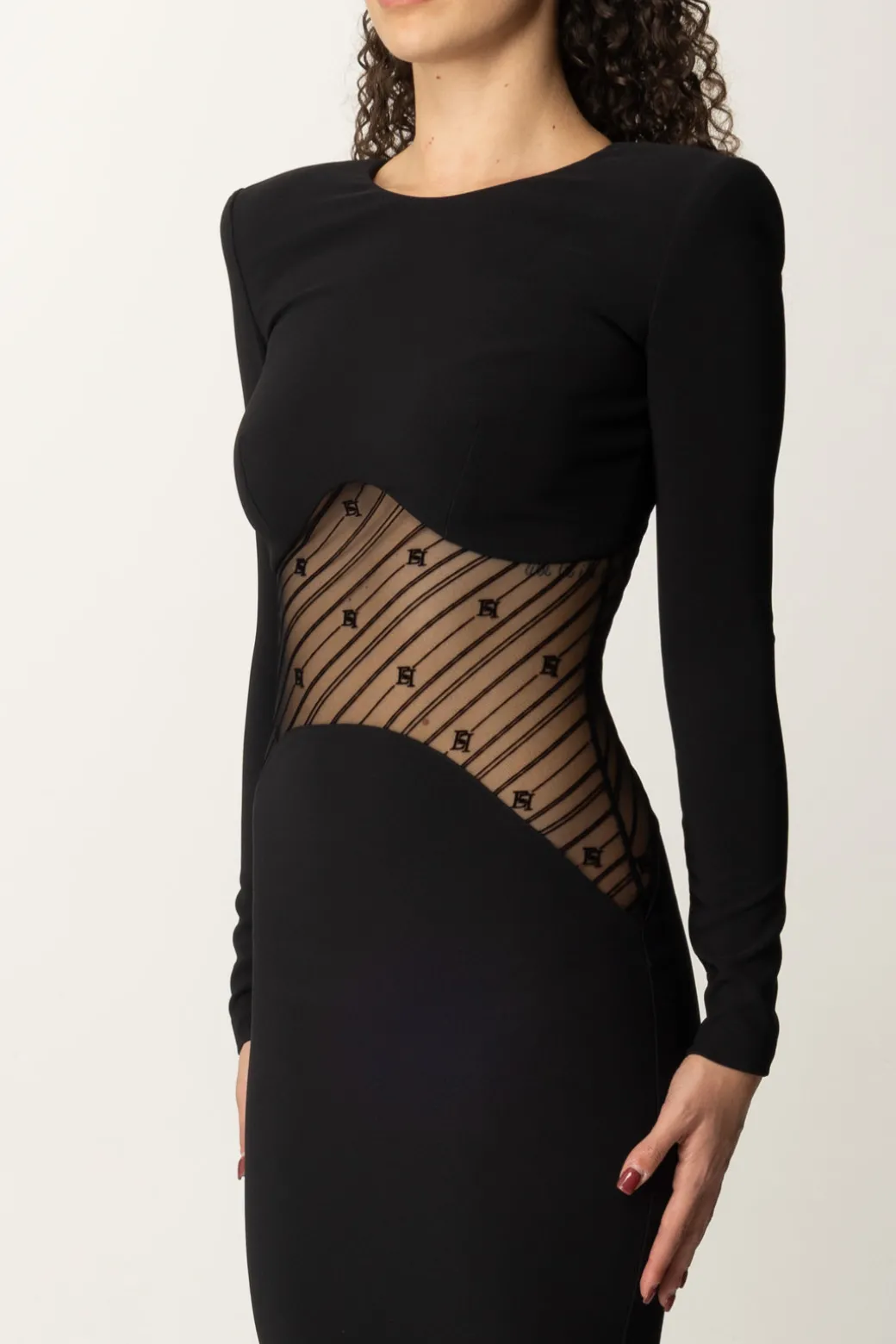 Affascinante abito Elisabetta Franchi della linea Red Carpet che gioca con la trasparenza del tulle a contrasto con la matericità del crepe stretch. Spalline imbottite e gonna a sirena, il punto vita è caratterizzato da un inserto in tulle con stampa flock che riproduce righe diagonali e il logo del brand. Illuminalo con accessori preziosi e svetta su tacchi altissimi: la passerella sarà tutta tua!