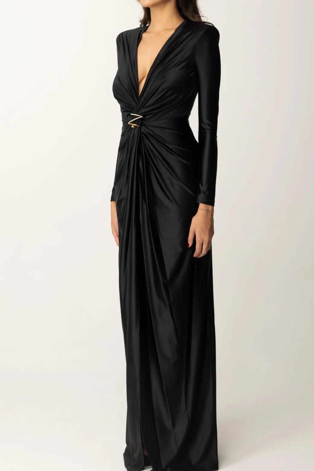 Una mise da diva grazie a questo abito Red Carpet Elisabetta Franchi, con i morbidi drappeggi che la luminosa lycra crea sulla tua silhouette a partire dal nodo frontale con accessorio gioiello. L’ampio spacco frontale fa paio con la profonda scollatura a V: un’ulteriore dose di femminilità per i tuoi galà.