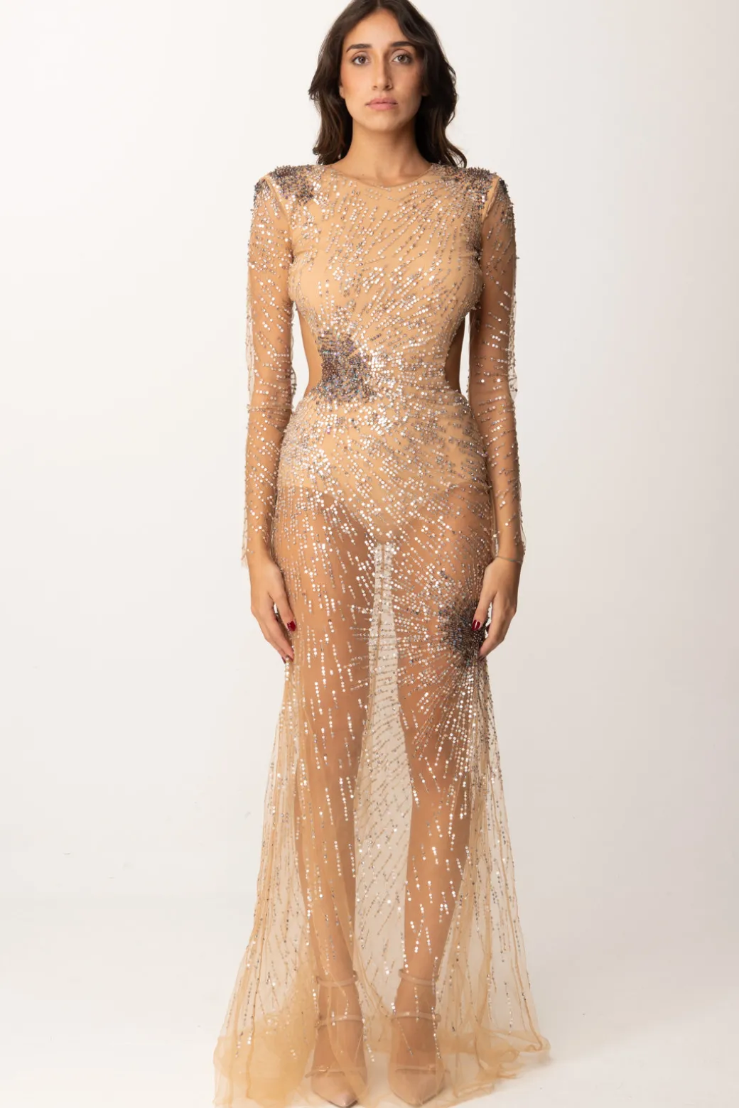 Scintillante come un fuoco d’artificio, una forma che del resto è richiamata in micro-paillettes dal ricamo sul tulle di questo strepitoso abito Red Carpet Elisabetta Franchi in tulle. Seducente con le sue trasparenze e l’ampia apertura sulla schiena, che diventa sui fronti un cut-out ai fianchi, una mise da gran galà che non vede l’ora di essere indossata.