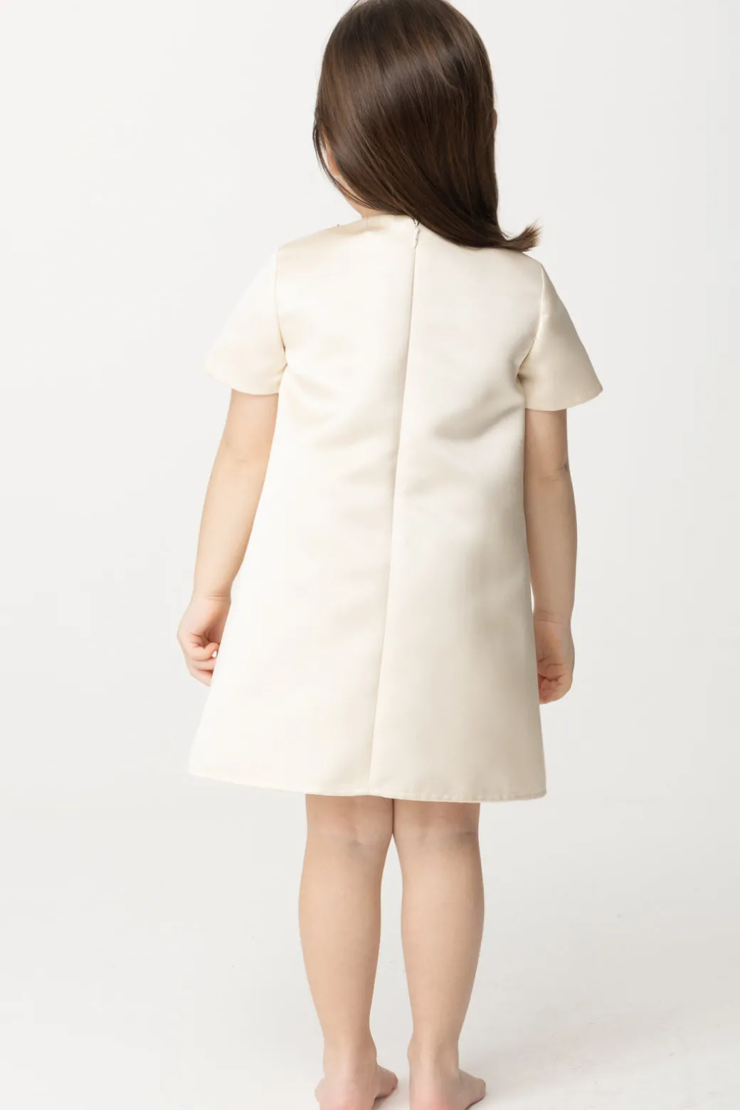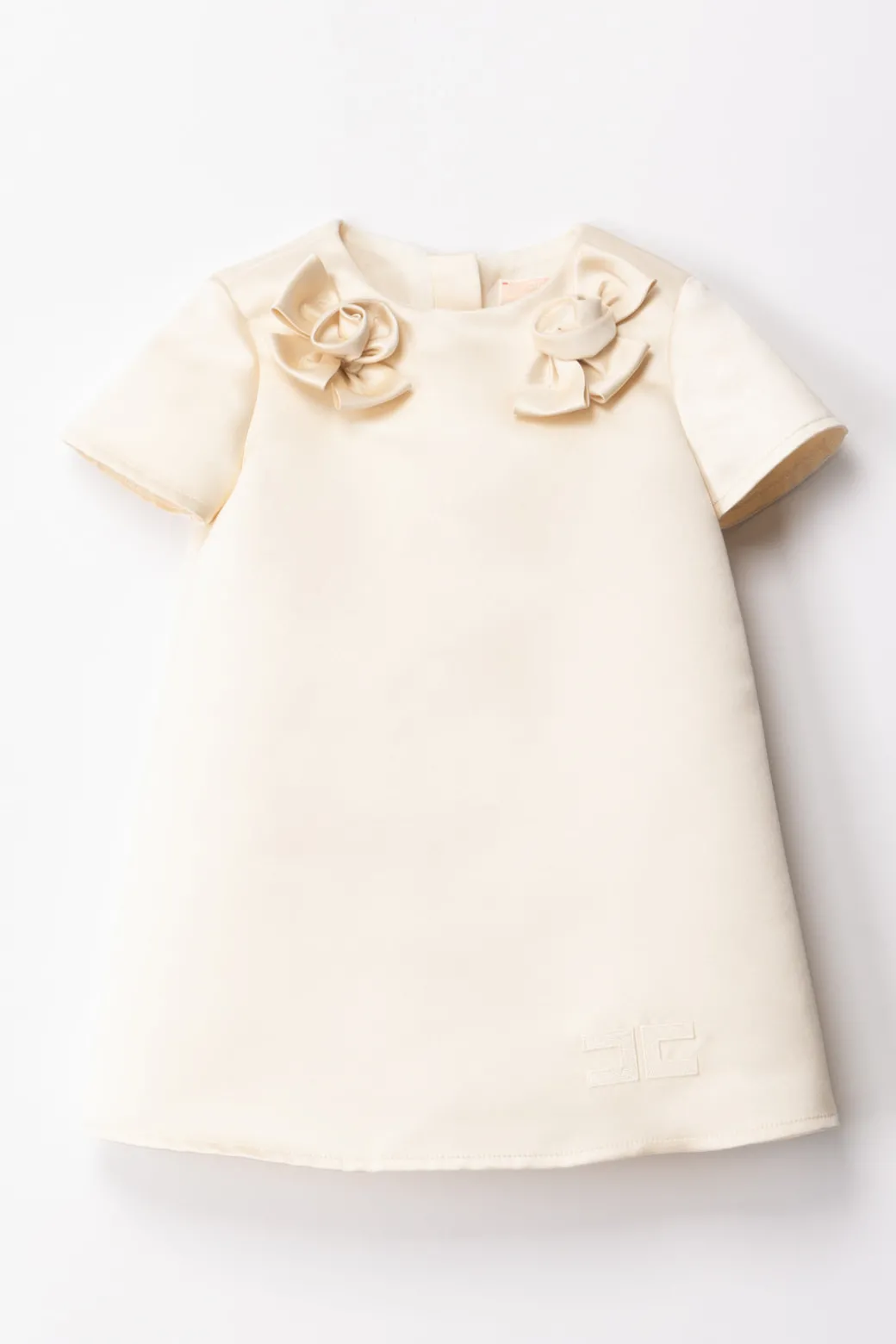 Le cerimonie del 2024 saranno all’insegna di outfit deliziosi come questo vestitino Elisabetta Franchi La mia Bambina in duchesse. A renderlo irresistibile, oltre che il design svasato con manichina corta, è l’applicazione di rose in tessuto ai lati della scollatura girocollo: un vero tocco di grazia per signorine di ogni età. Ricamo in tintia logo CC sul fondo.