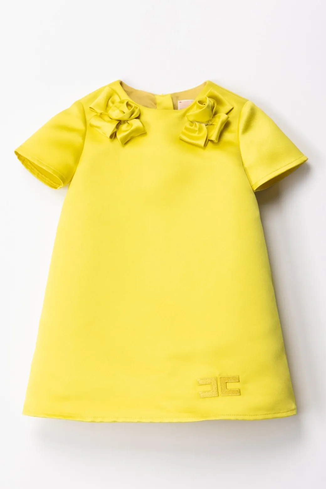 Le cerimonie del 2024 saranno all’insegna di outfit deliziosi come questo vestitino Elisabetta Franchi La mia Bambina in duchesse. A renderlo irresistibile, oltre che il design svasato con manichina corta, è l’applicazione di rose in tessuto ai lati della scollatura girocollo: un vero tocco di grazia per signorine di ogni età. Ricamo in tintia logo CC sul fondo.