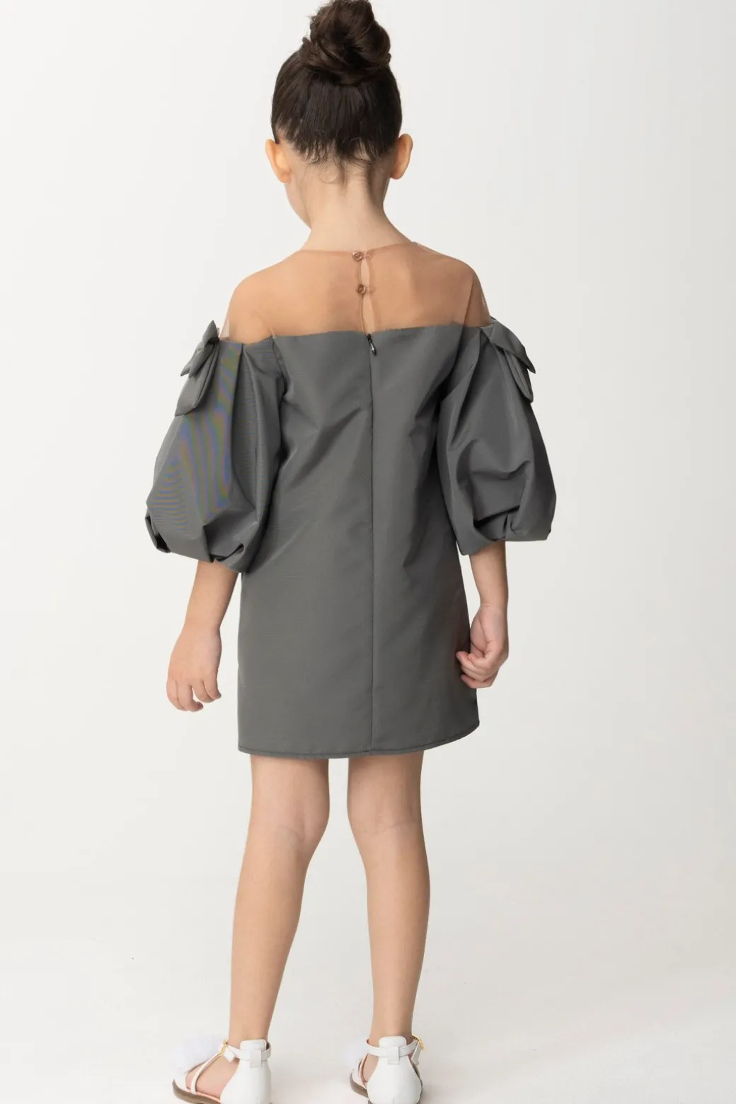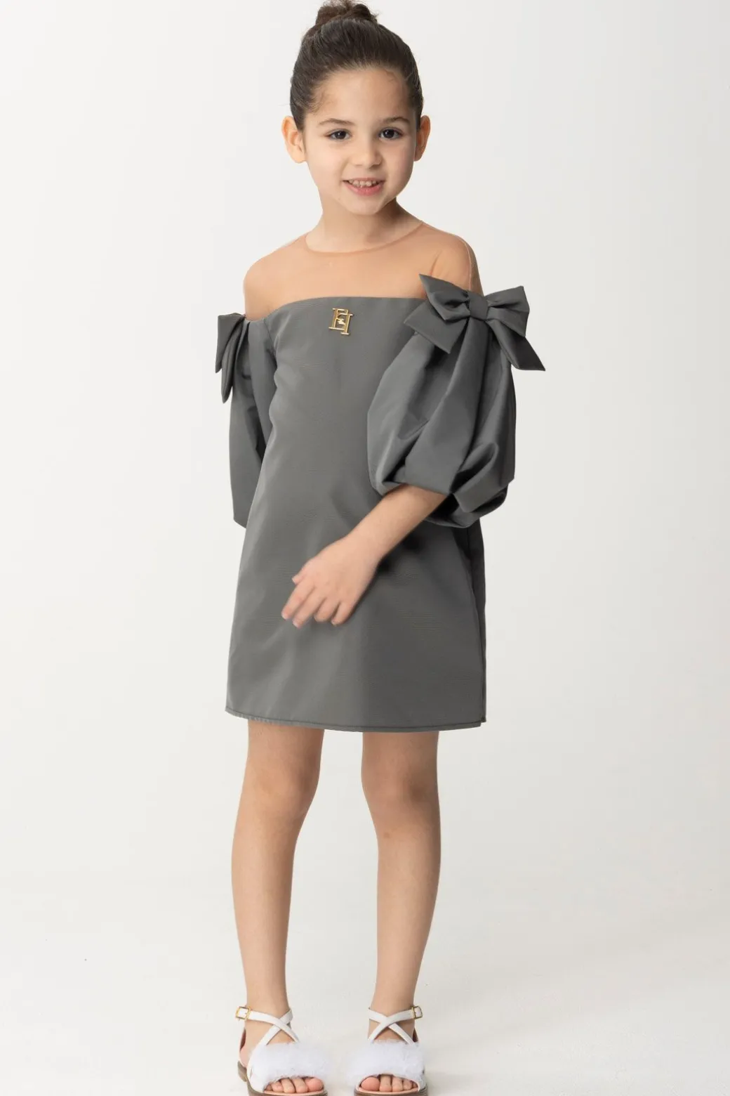 Abito Elisabetta Franchi la mia bambina che emana il perfetto mood da principessa! A renderlo speciale sono i suoi piccoli dettagli di stile, come la “scollatura” a barca che lascia le spalle ricoperte solo dal leggero tulle, le voluminose maniche a palloncino e infine i due fiocchetti che lo completano con un tocco super chic. Ideale per le occasioni speciali!