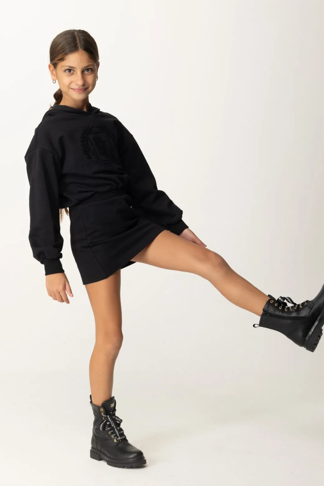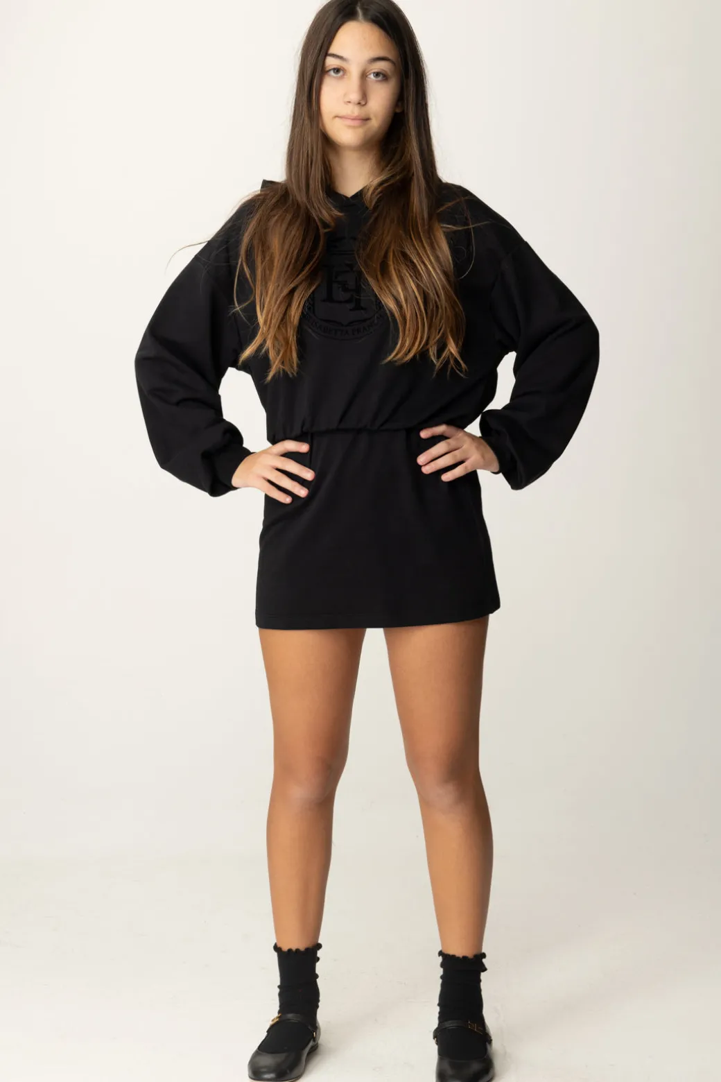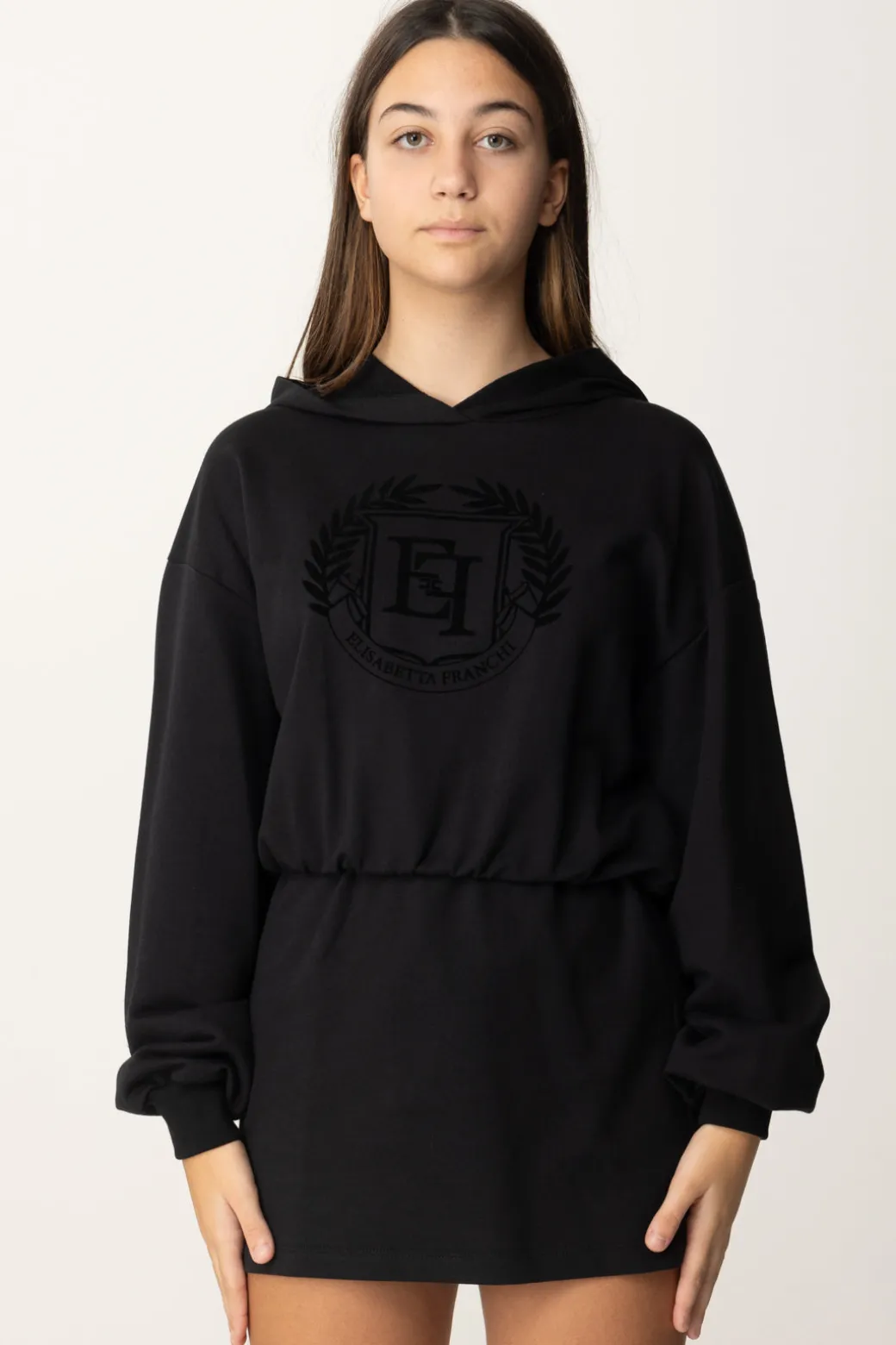 Sportivo e divertente mini abito La mia bambina Elisabetta Franchi stile felpa, caratterizzato dal logo EF in stile stemma ricamato sul petto e cappuccio. Il punto vita è sagomato e crea un effetto blusato al top: un abito da bimba ma che non ha nulla da invidiare allo stile delle grandi!