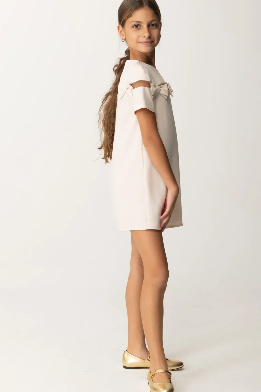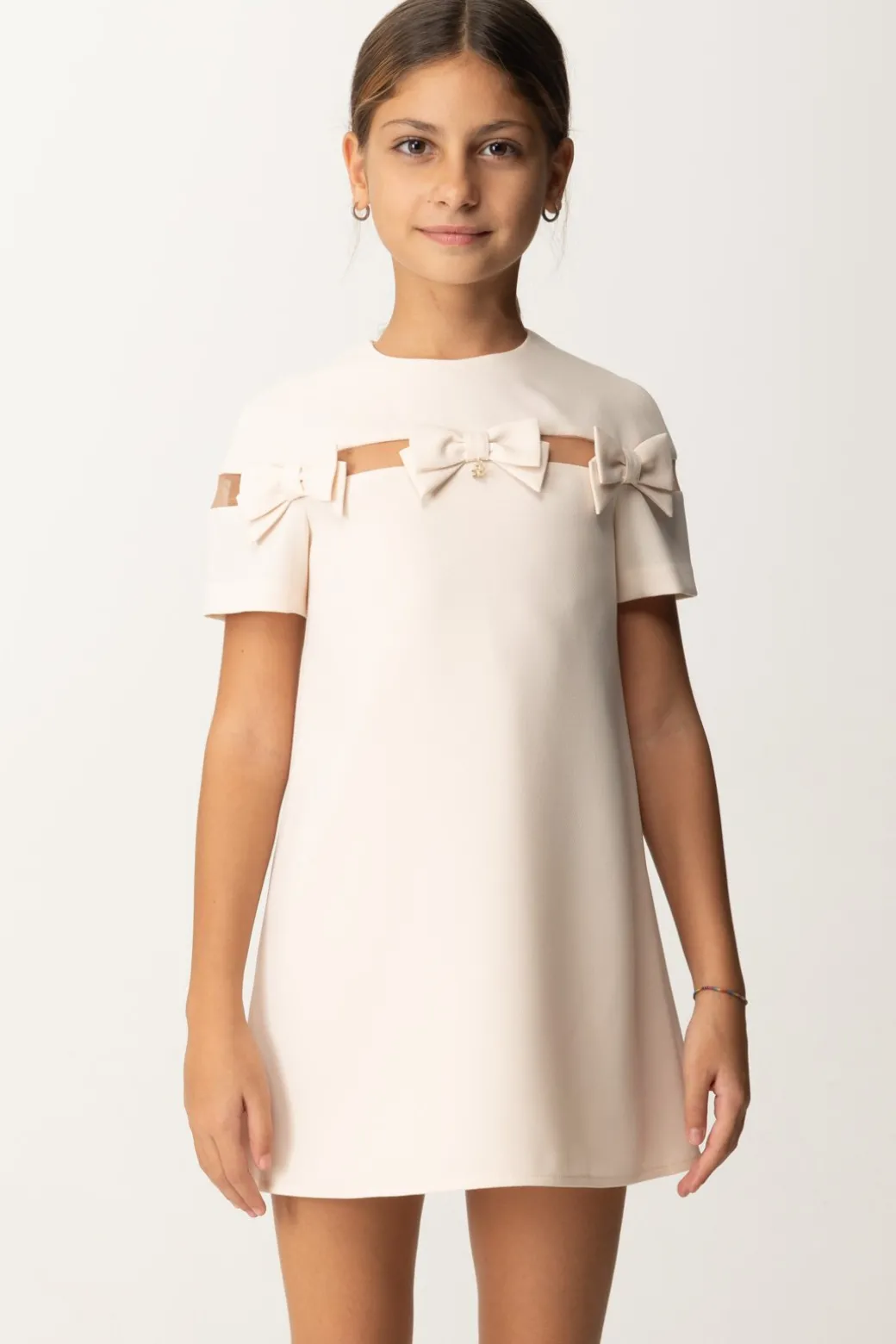 Fiocchetti bon ton si alternano ad inserti in tulle trasparenze che creano un effetto cut-out nella parte alta di questo bellissimo abito La mia bambina Elisabetta Franchi, ideale per gli eventi di stagione. Elegante e chic, completa il suo outfit con una scarpetta delicata, come un mocassino o una ballerina, che renda ancora più aggraziata questa mise.