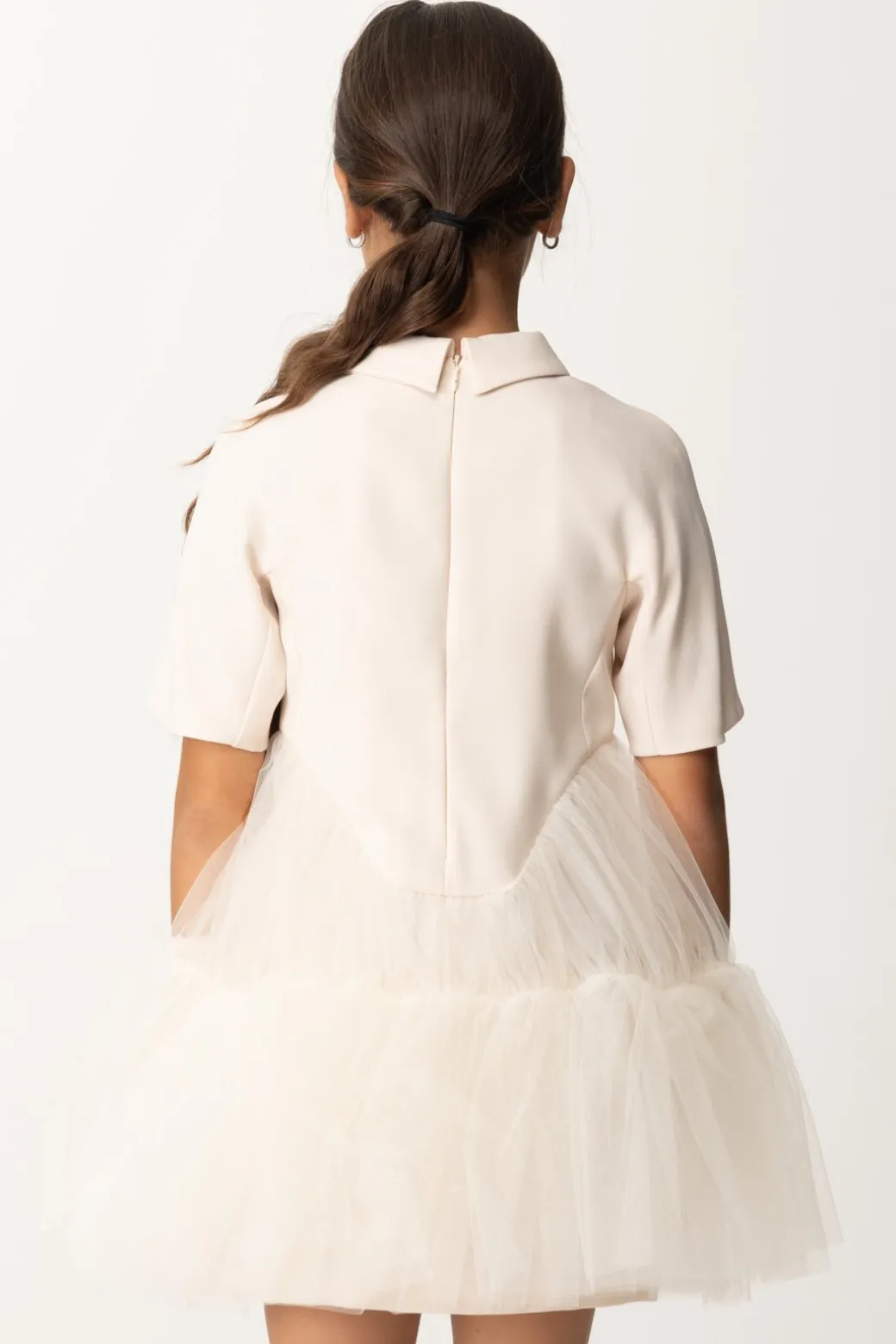Chic e divertente abito La mia bambina Elisabetta Franchi che combina un top in duchesse, con manica corta e un grazioso collettino a camicia con ricamo logo lettering a contrasto, con un’ampia gonna in tulle in tinta, svasata dal punto vita in giù. una mise deliziosa, ideale per gli eventi di stagione.