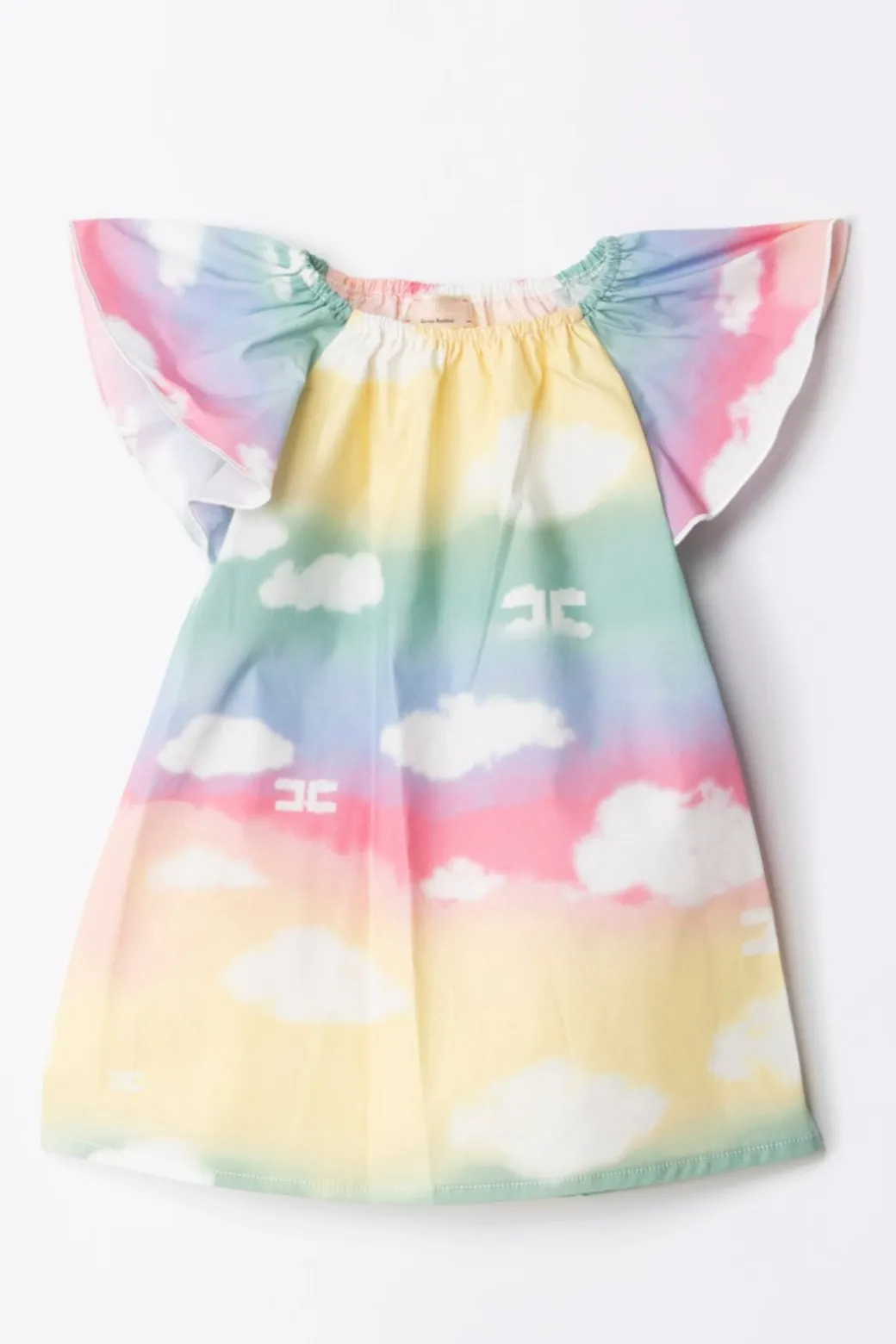 Questo abito La mia bambina Elisabetta Franchi è un dolce viaggio attraverso un cielo incantato, dove morbide nuvole danzano tra sfumature di arcobaleno, regalando un tocco di magia ad ogni piccola principessa che lo indossa. I loghi di Elisabetta Franchi sono sottilmente incorporati nel design, fondendosi senza problemi con il motivo colorato.