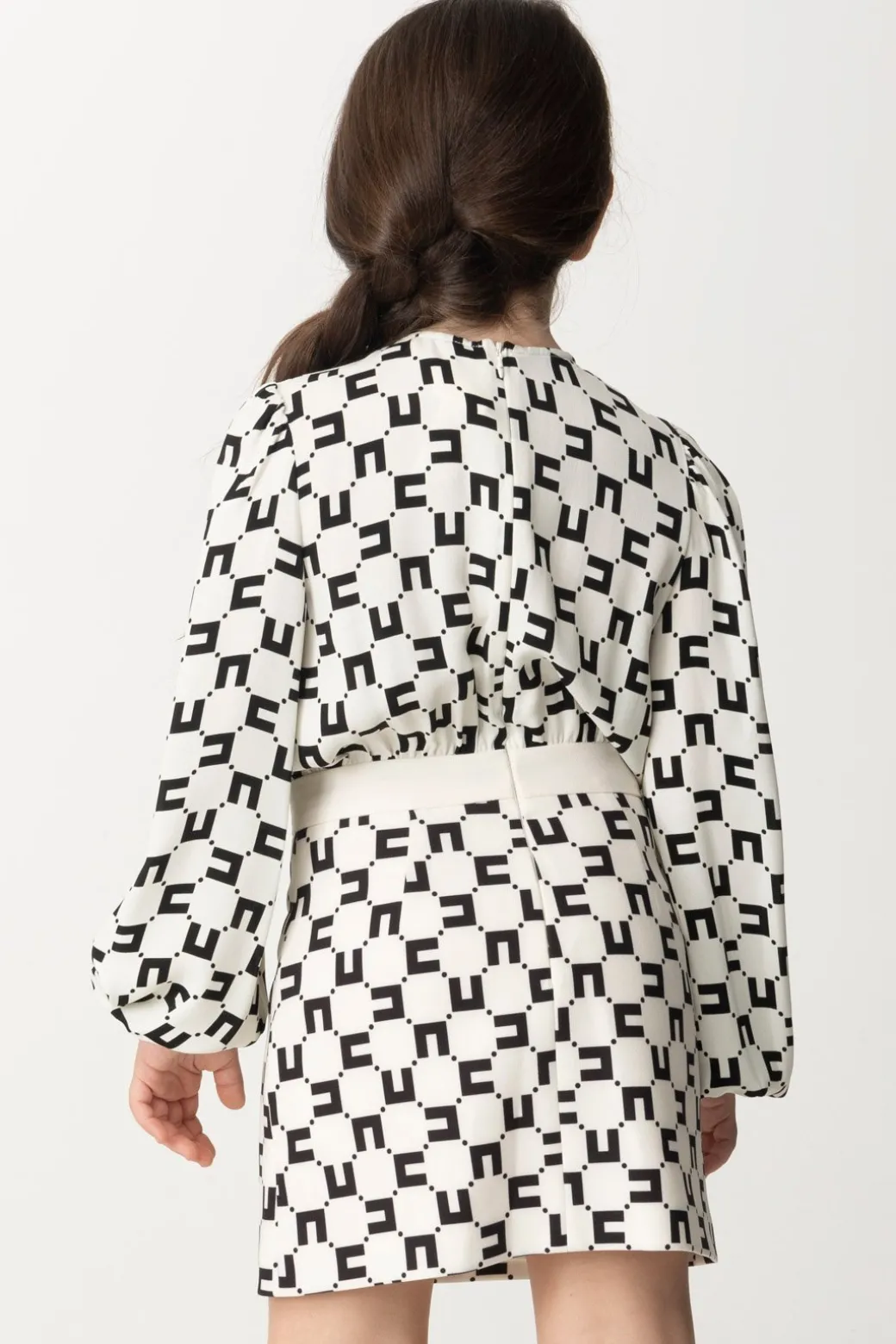 La stampa logo cubica rappresentativa della collezione caratterizza questo abito La mia bambina Elisabetta Franchi in crepe, che somiglia davvero a una mise “da grandi”. Top come una morbida blusa con maniche lunghe effetto balloon, la gonna invece è una mini aderente, caratterizzata dalla presenza di una placca logo oro al punto vita. Una vera signorina, specialmente se completerai il suo look con borsa e altri accessori del brand!