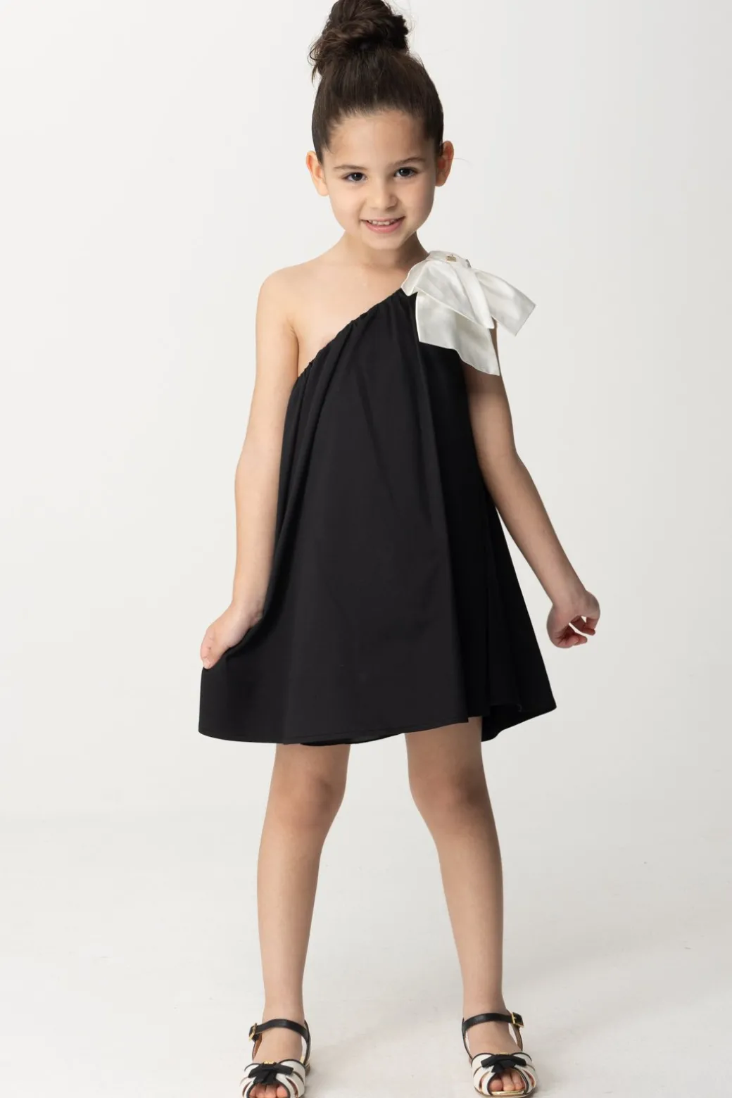 Essenziale, spensierata ma anche elegante al tempo stesso: amiamo questo abito La mia Bambina Elisabetta Franchi, con il suo design semplice e versatile. Svasato, il design monospalla è arricchito dalla presenza di un bel fiocco con applicazione logo: un look per tutte le feste d’estate, per cui basterà un cambio scarpe – da sandali a ballerine – per cambiare il mood di questo delizioso prendisole.