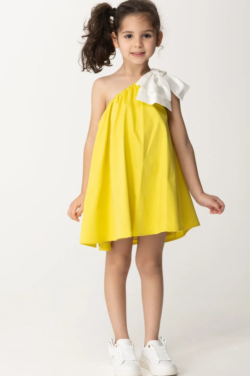 Essenziale, spensierata ma anche elegante al tempo stesso: amiamo questo abito La mia Bambina Elisabetta Franchi, con il suo design semplice e versatile. Svasato, il design monospalla è arricchito dalla presenza di un bel fiocco con applicazione logo: un look per tutte le feste d’estate, per cui basterà un cambio scarpe – da sandali a ballerine – per cambiare il mood di questo delizioso prendisole.