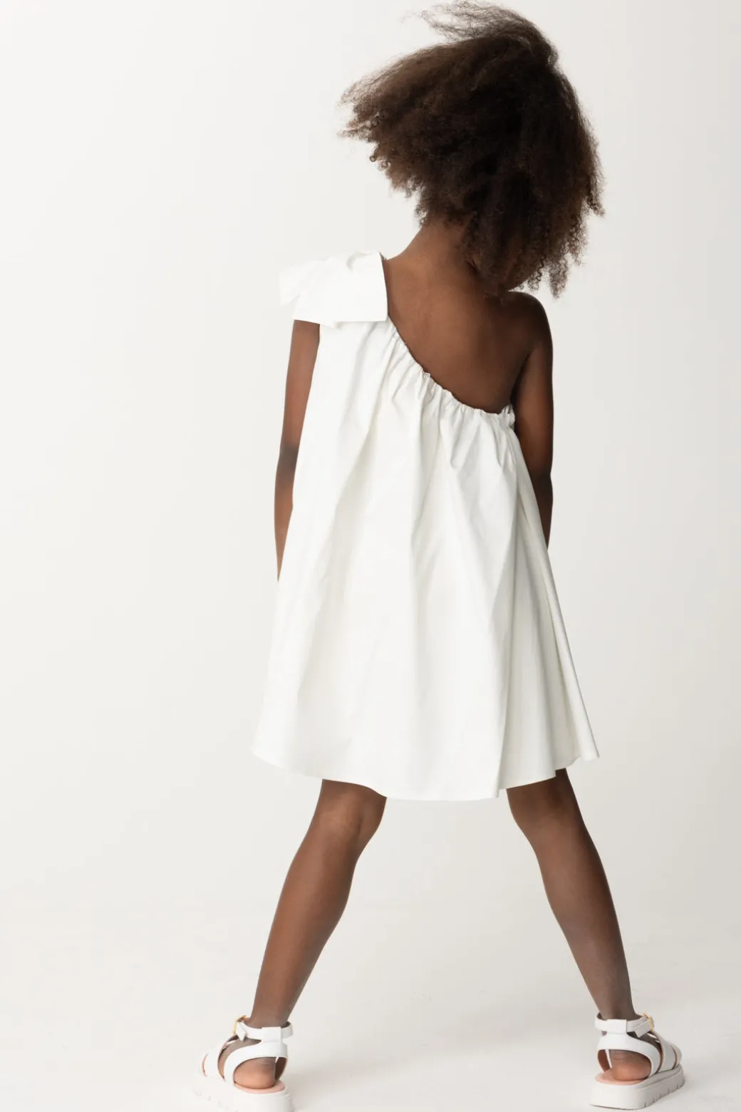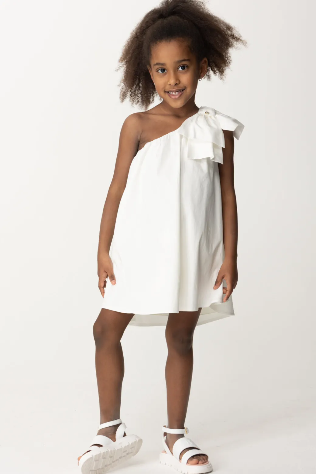 Essenziale, spensierata ma anche elegante al tempo stesso: amiamo questo abito La mia Bambina Elisabetta Franchi, con il suo design semplice e versatile. Svasato, il design monospalla è arricchito dalla presenza di un bel fiocco con applicazione logo: un look per tutte le feste d’estate, per cui basterà un cambio scarpe – da sandali a ballerine – per cambiare il mood di questo delizioso prendisole.