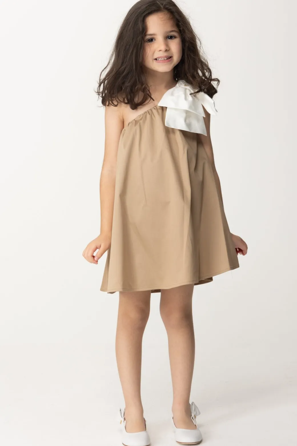 Essenziale, spensierata ma anche elegante al tempo stesso: amiamo questo abito La mia Bambina Elisabetta Franchi, con il suo design semplice e versatile. Svasato, il design monospalla è arricchito dalla presenza di un bel fiocco con applicazione logo: un look per tutte le feste d’estate, per cui basterà un cambio scarpe – da sandali a ballerine – per cambiare il mood di questo delizioso prendisole.