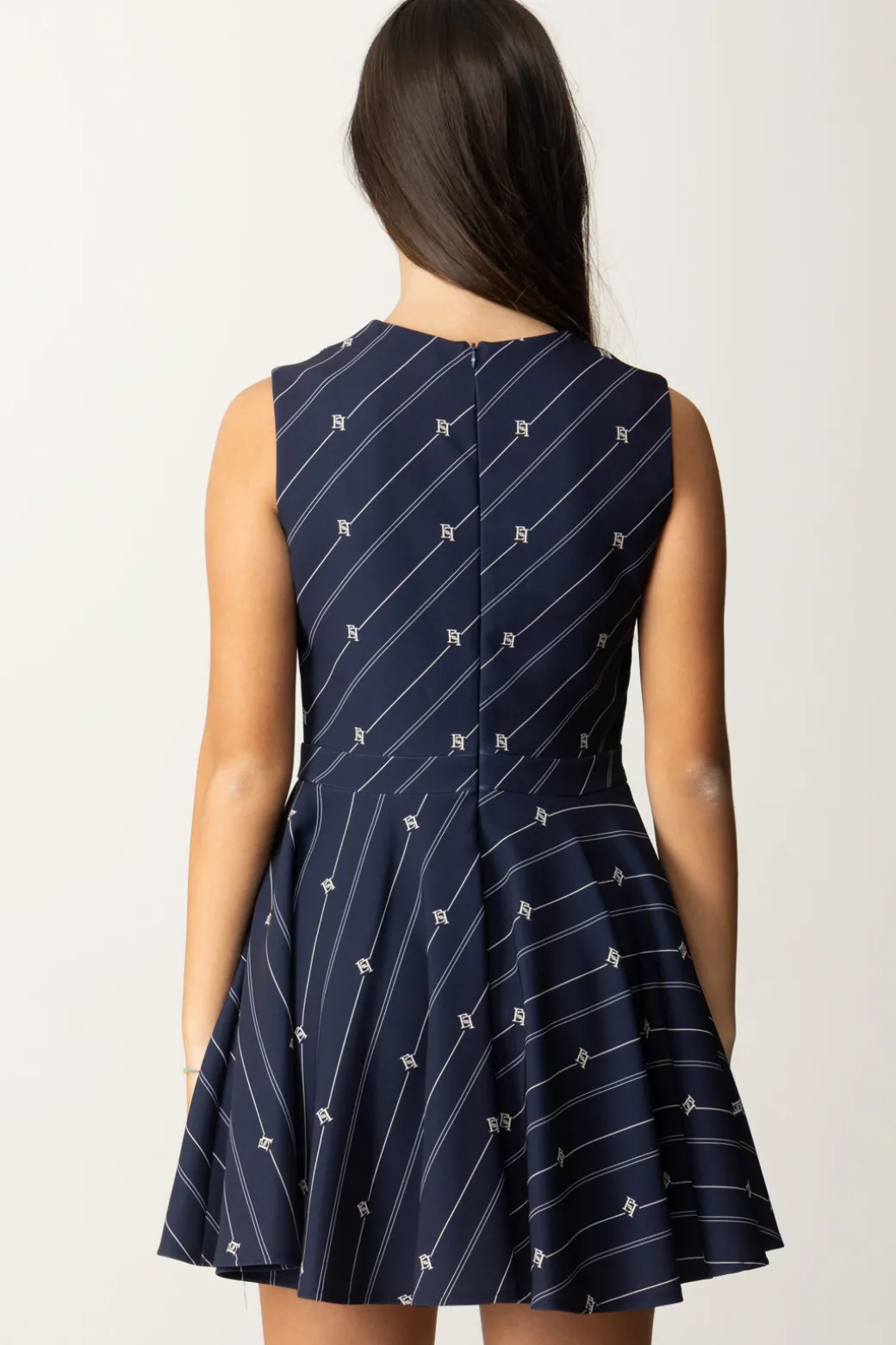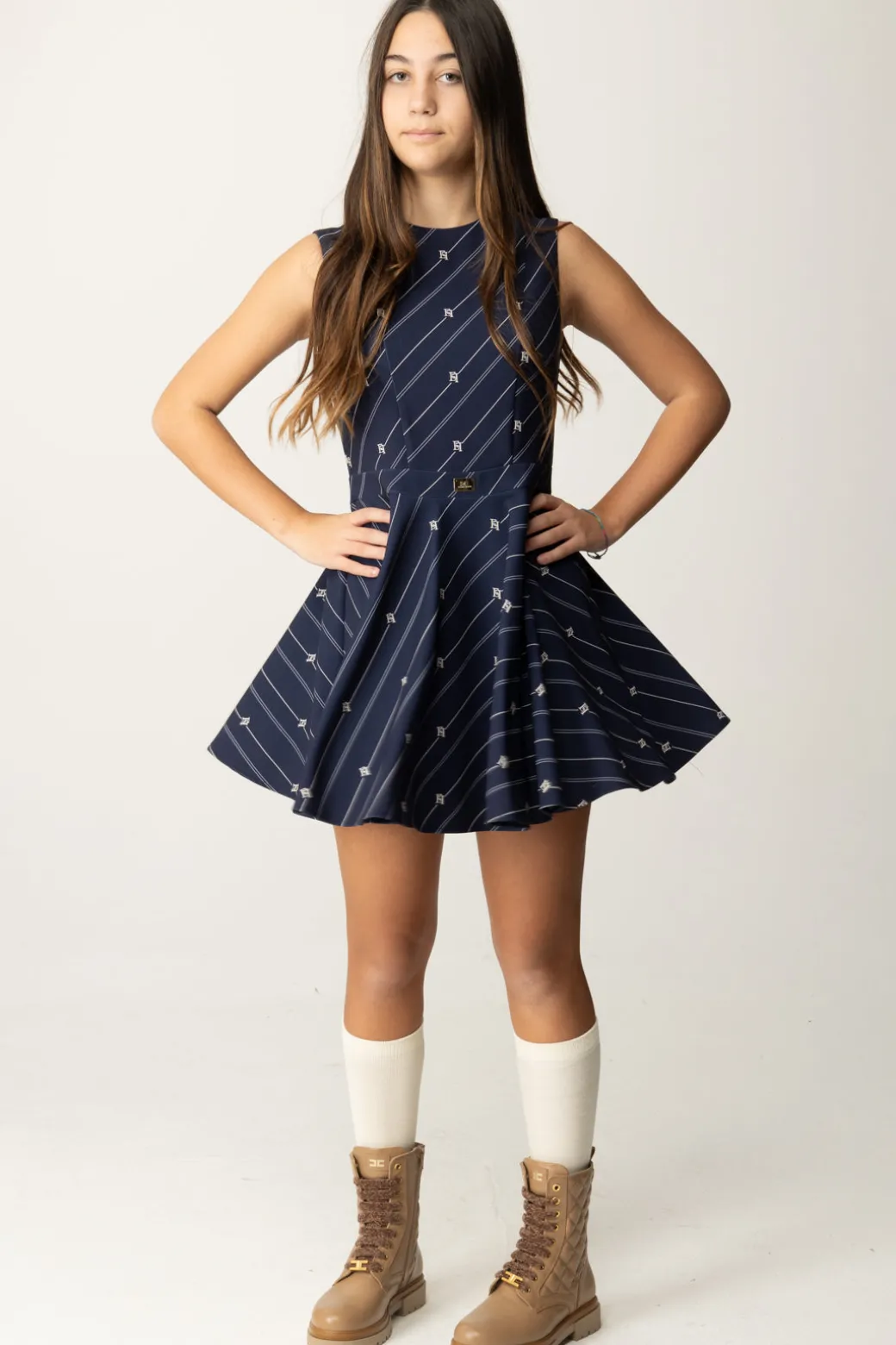 Abito Elisabetta Franchi La mia bambina realizzato in crepe e caratterizzato da un elegante design con gonna svasata e stampa a righe e logo EF, per un risultato estremamente chic. Smanicato, combinalo con una camicetta o una maglia dolcevita per outfit che vadano bene per tutta la stagione e completa il look con una delle calzature del brand per un look rifinito in ogni dettaglio, in pieno stile EF.