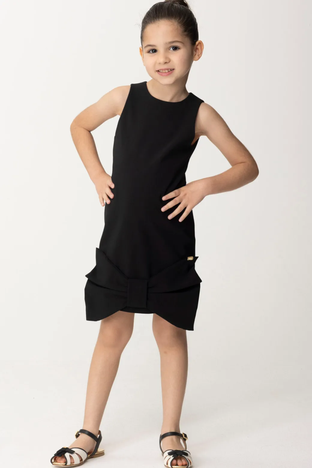 Tessuto stretch e vestibilità a tubino per questo abito Elisabetta Franchi La mia bambina, bellissimo da indossare per le cerimonie di stagione, con il suo bel maxi fiocco a fondo gonna. Smanicato e con taglio sopra al ginocchio, ompletalo con una giacca crop, anche effetto pelle per aggiungere una nota casual e cool a questo outfit da vera signorina.