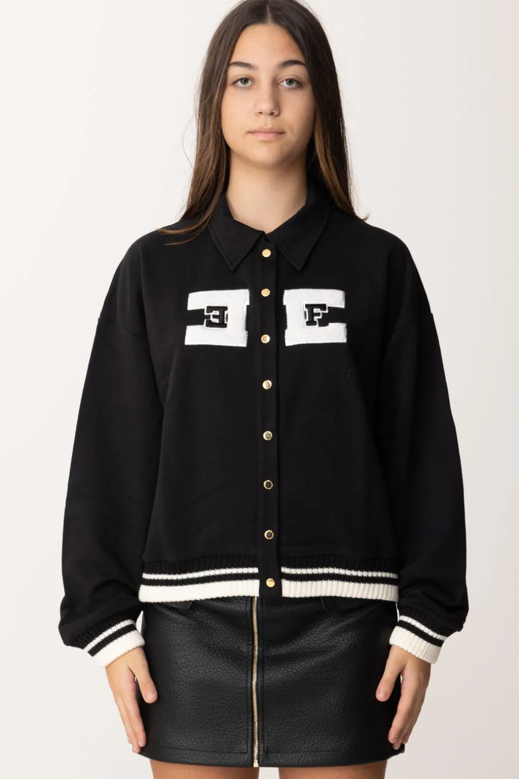 Un’originale felpa Elisabetta Franchi La mia bambina che racconta del mood college della collezione attraverso l’uso dei colori e del logo ricamato sul petto. Colletto a camicia, fila di bottoncini e orli a costine a contrasto di colore, un capo trendy e originale per outfit da tutti i giorni.