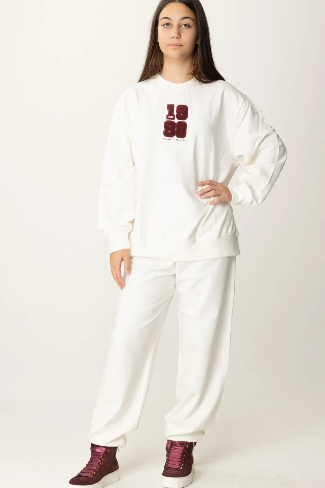 Sportiva al punto giusto, questa felpa Elisabetta Franchi La mia bambina si riconnette al resto della collezione e al gusto college grazie alla patch sul petto, formato 1998 realizzato in punto spugna. Il fit è over, il design nel complesso super versatile: prova a immaginarla con una camicetta e un pantalone per un outfit casual chic al passo coi tempi e molto teen.