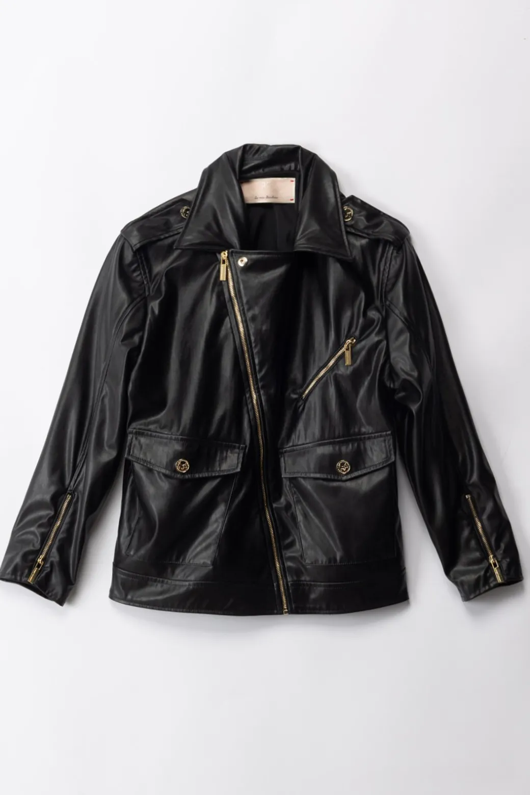 Giacca in pelle Elisabetta Franchi La mia Bambina per un outfit trendy e grintoso, adatto alle piccole amanti dello stile. Realizzato con una zip gold asimmetrica che richiama le zip presenti sulle maniche e il tono gold dei bottoncini posti sulle tasche, ai colletti e sulle spalle.