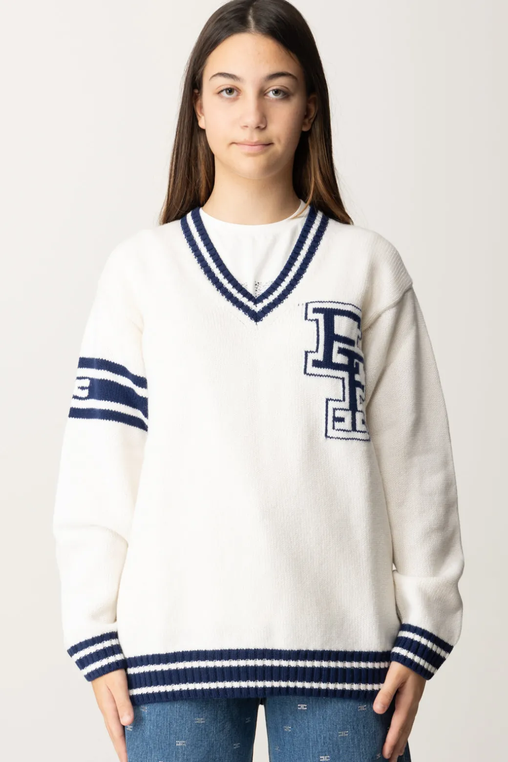 Perfettamente a metà strada tra l’elegante e il casual, perfettamente in linea con l’ispirazione college della collezione, questo maglione Elisabetta Franchi La mia bambina è a pieno titolo un must-have di stagione! Realizzato in lana merinos, sarà bellissimo da indossare sia a solo che in combinazione con camicette per un risultato super chic ad ogni età.