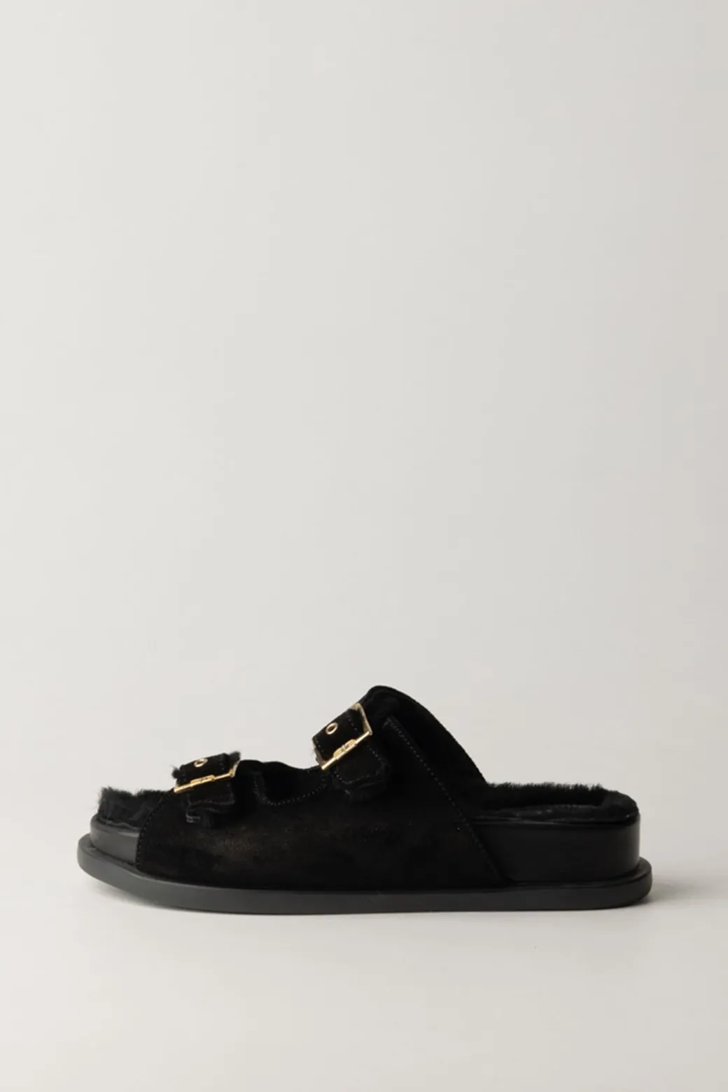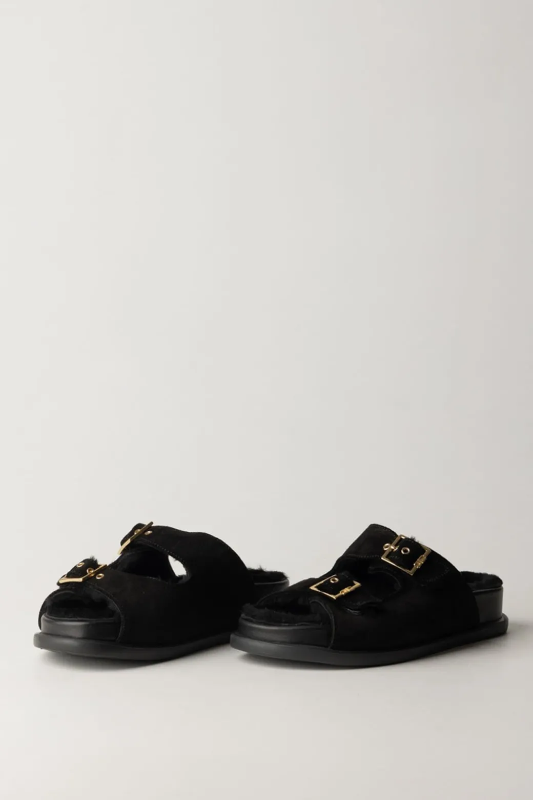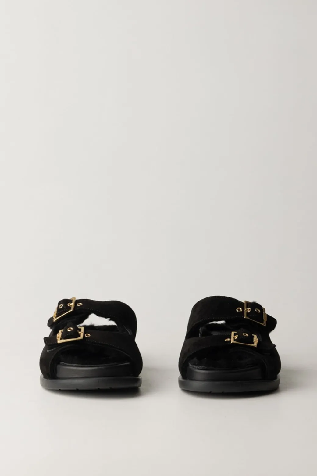 Comodità ai suoi piedi: con questi sandali a ciabatta La mia bambina Elisabetta Franchi! Vera pelle scamosciata con inserto in pelliccia nel sottopiede, sono caratterizzate da cinghiette con fibbia dorata: il massimo del comfort e dello stile pret-a-porter.