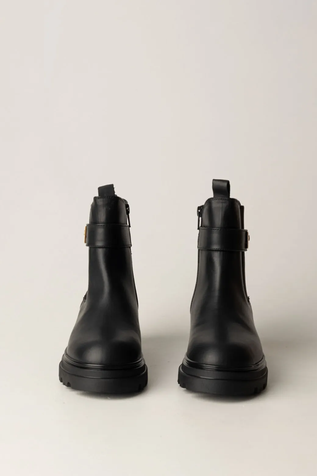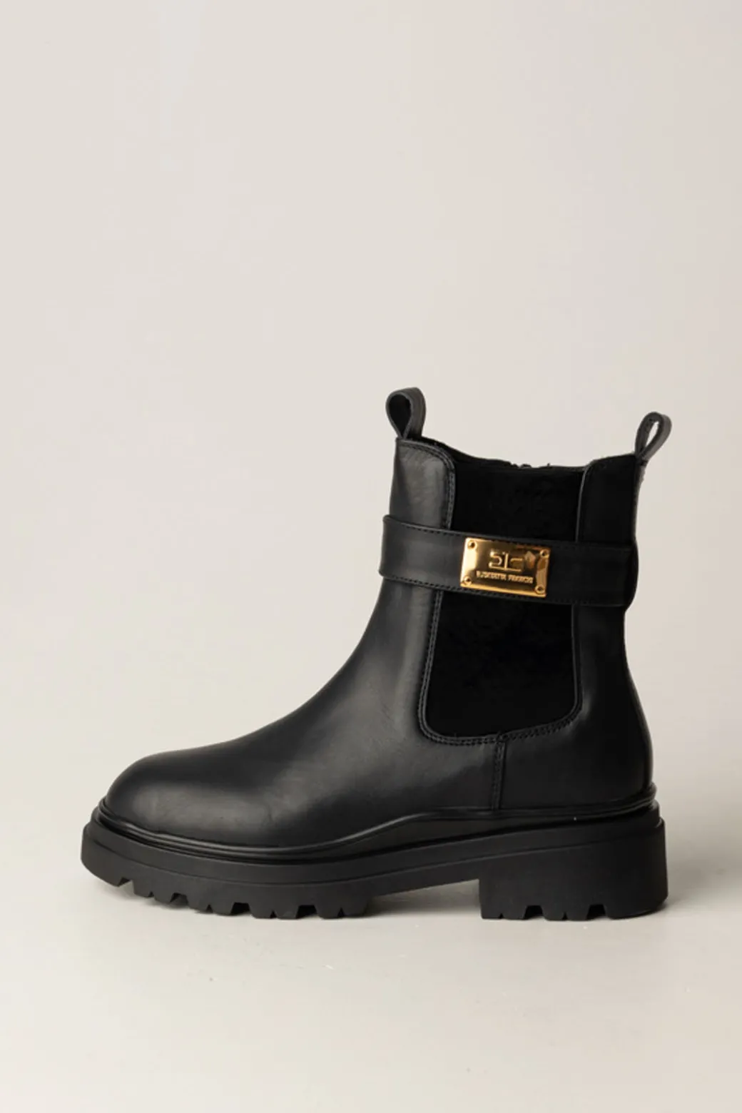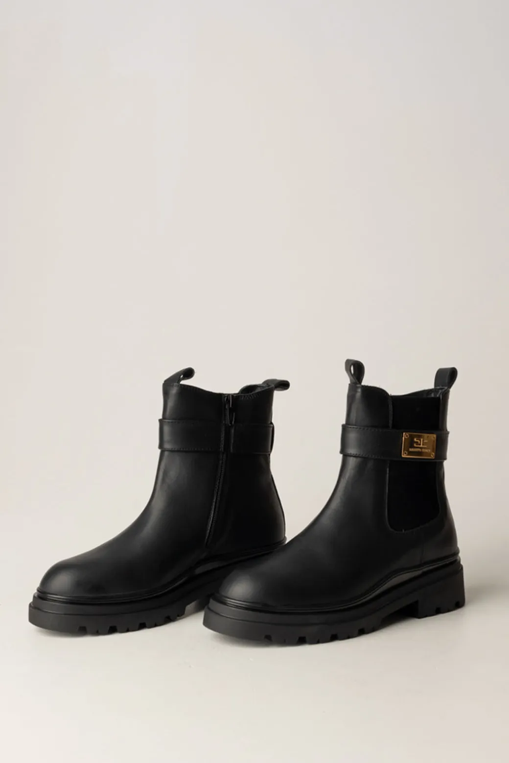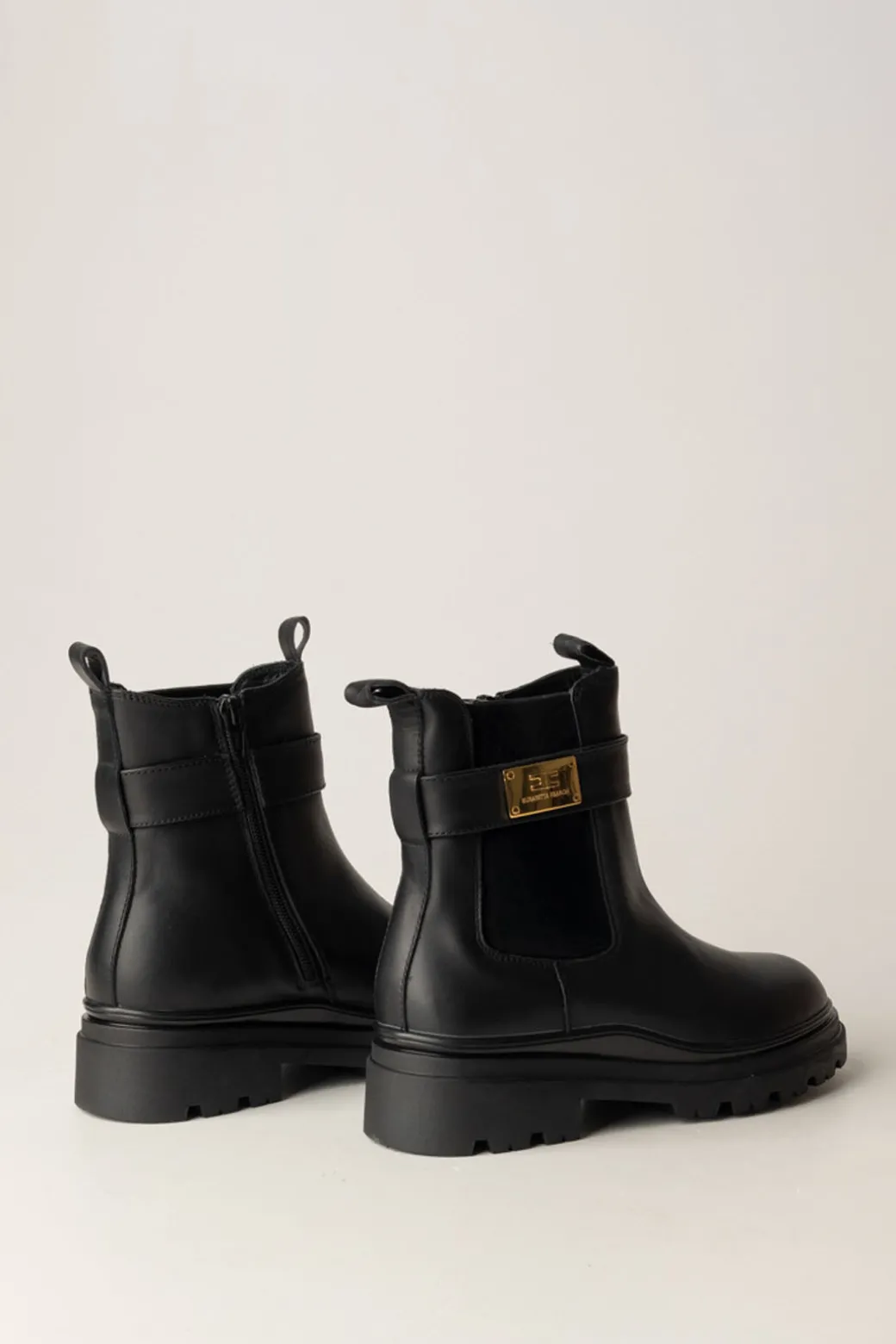 Stivaletti Elisabetta Franchi La mia Bambina in vera pelle, completati da una fascetta alla caviglia con placchetta logo in oro, perfetti per completare tantissimi look di stagione: quotidiane con denim e shorts, elegantine con pantaloni palazzo e tute.