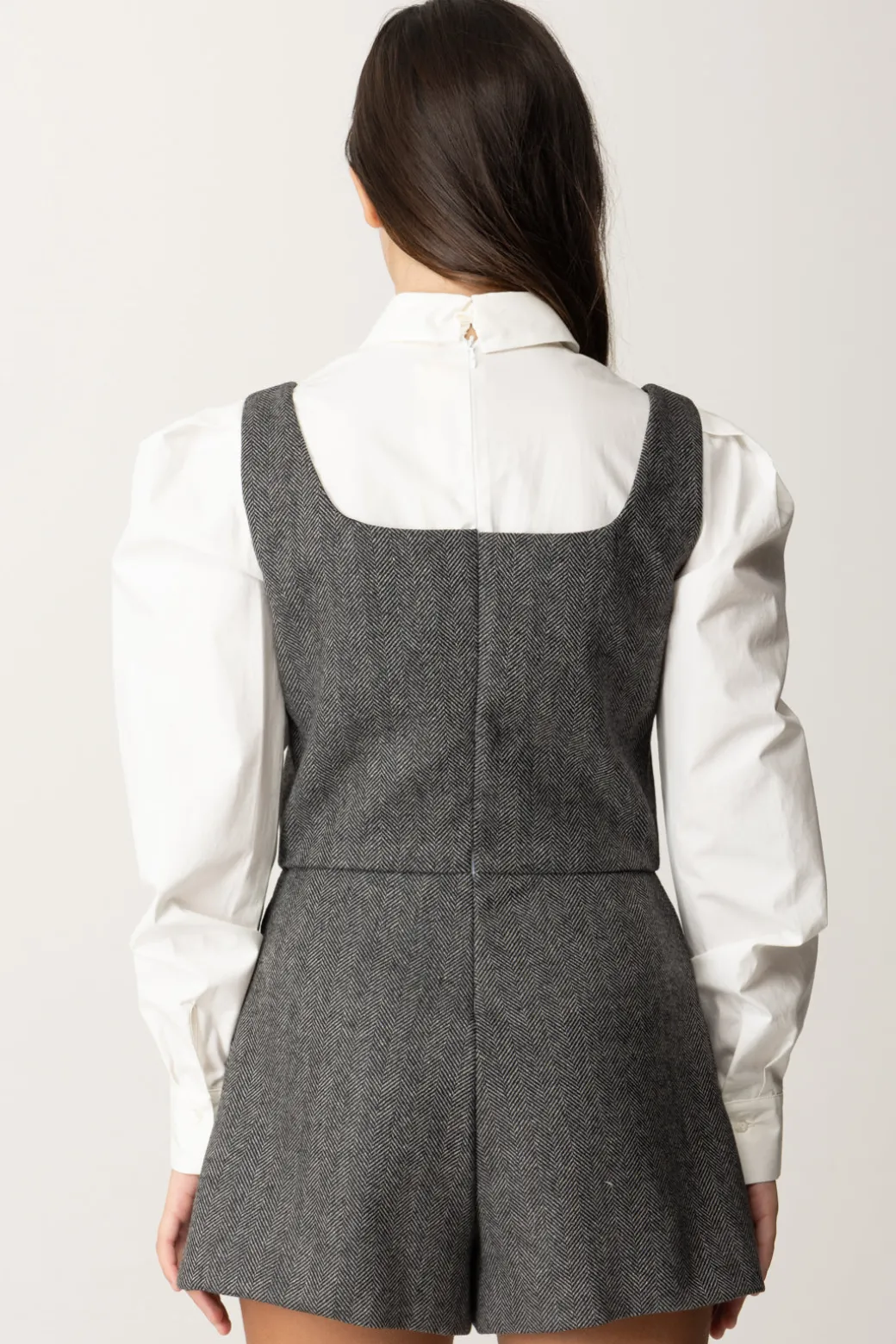Un capo per distinguersi agli eventi della stagione: non meno elegante che un abito, eccoti una strepitosa tuta corta La mia bambina Elisabetta Franchi. Un unico pezzo che simula un outfit di ben tre capi, mettendo insieme uno shorts con un gilet in lana, con luminosi bottoni dorati, con un inserto a camicia con maniche baloon: manca solo un bel mocassino per completare una mise impeccabile!