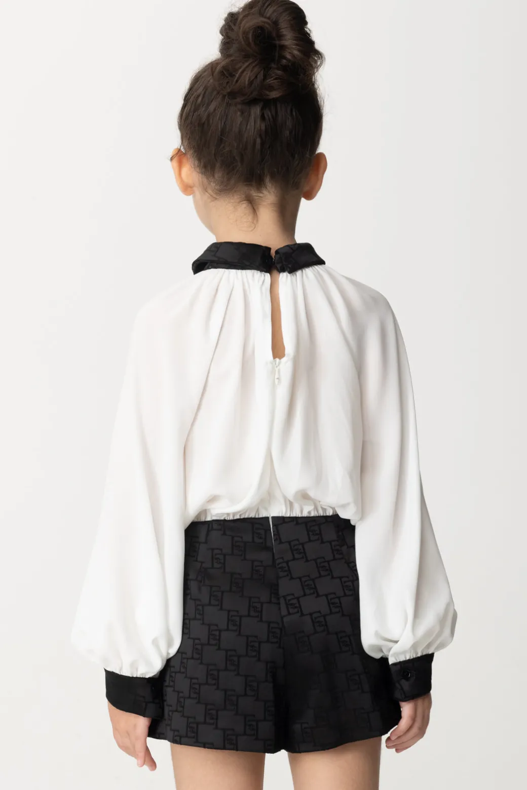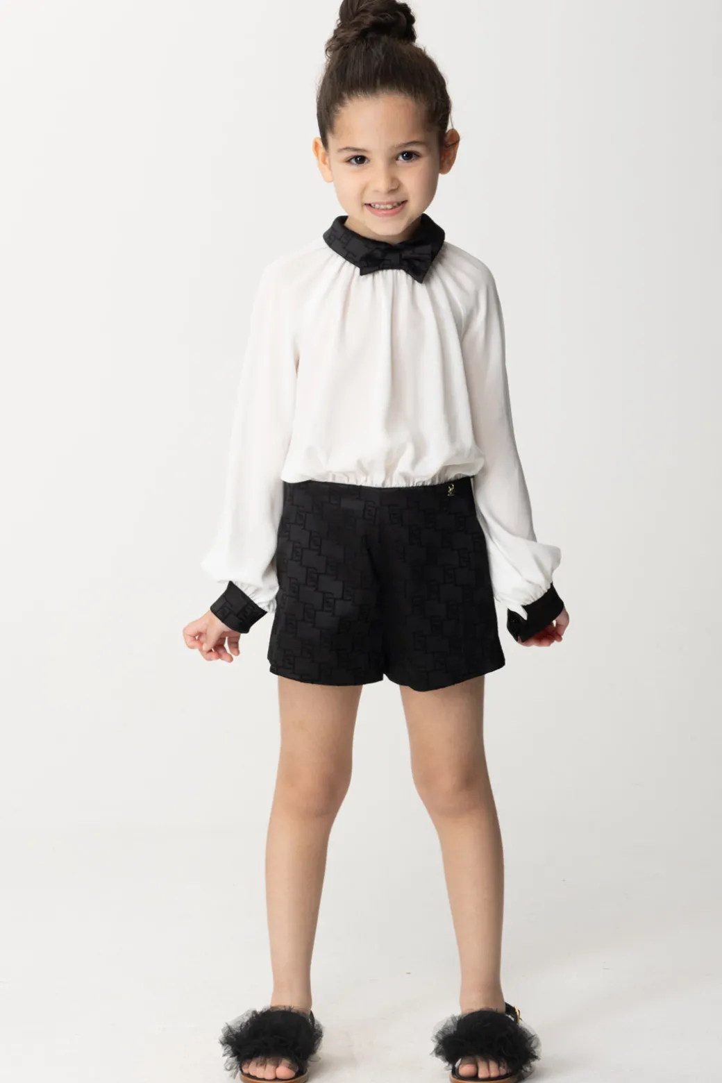 Ma quanto è carina questa tuta La mia bambina Elisabetta Franchi? Delizioso capo dal taglio corto, mette insieme un pantaloncino in raso con stampa monogram e una cmaicetta in georgette con dettagli in raso stampato, che richiamano il bottom: un insieme perfetto in ogni particolare, una tuta da sfoggiare per cerimonie ed eventi speciali di stagione.