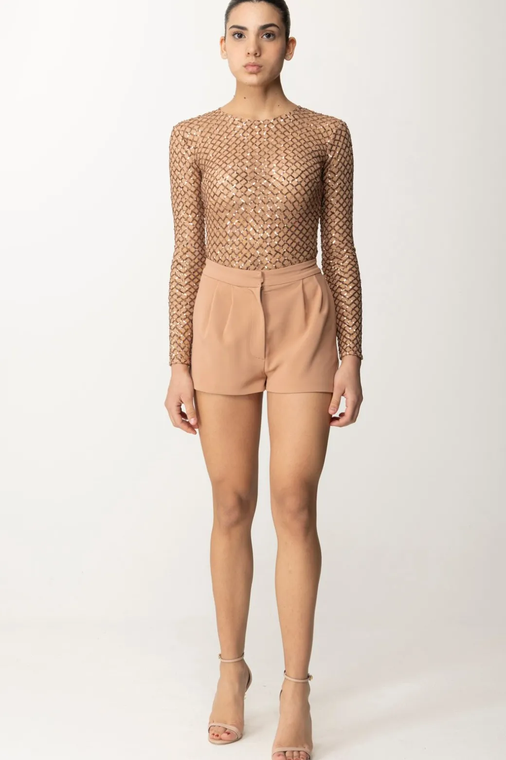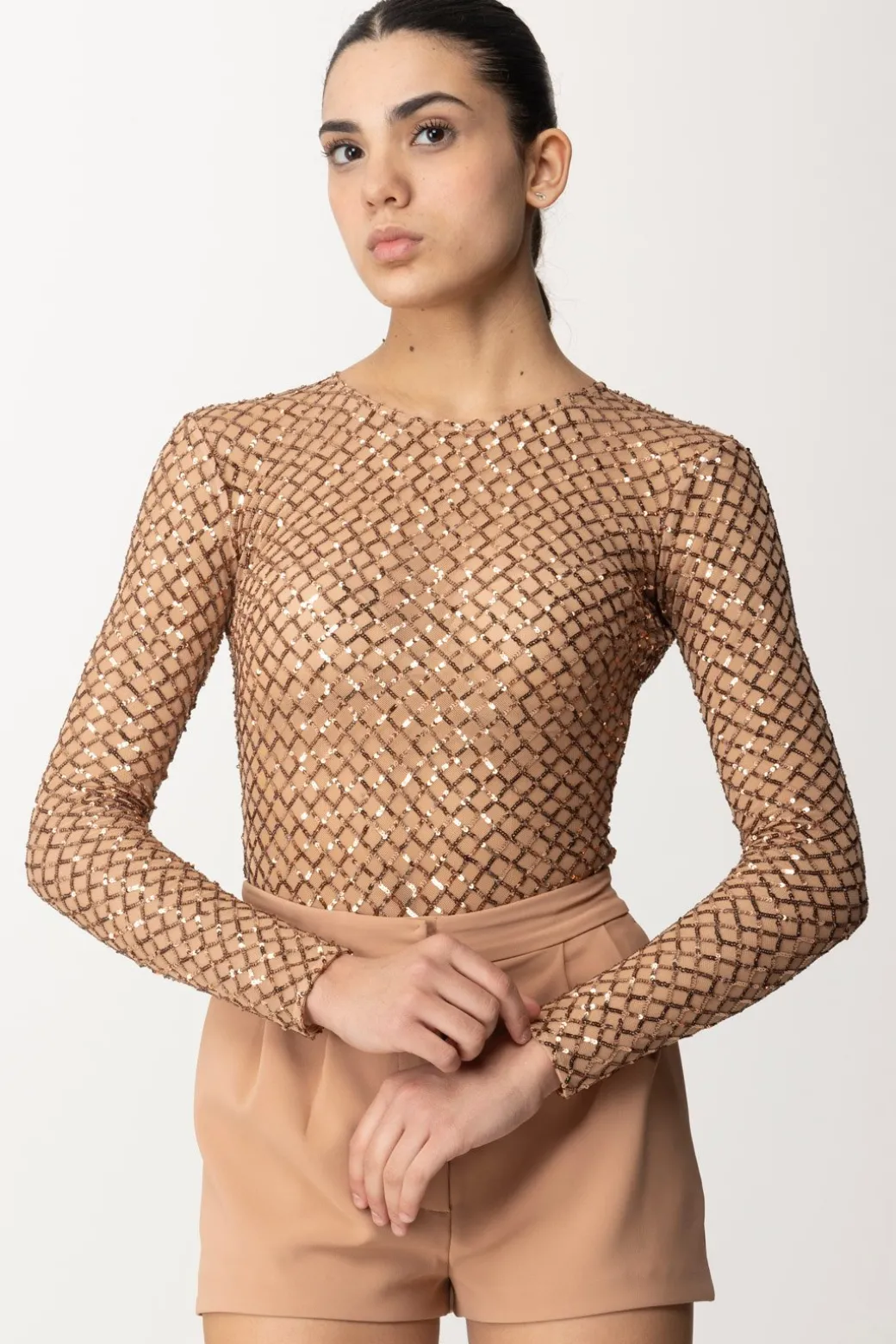 Body Elisabetta Franchi realizzato in tulle e interamente ricamato da luminose paillettes con un disegno in eleganti linee a zig-zag. Perfetto per illuminare qualsiasi outfit con un tocco di glamour sofisticato.