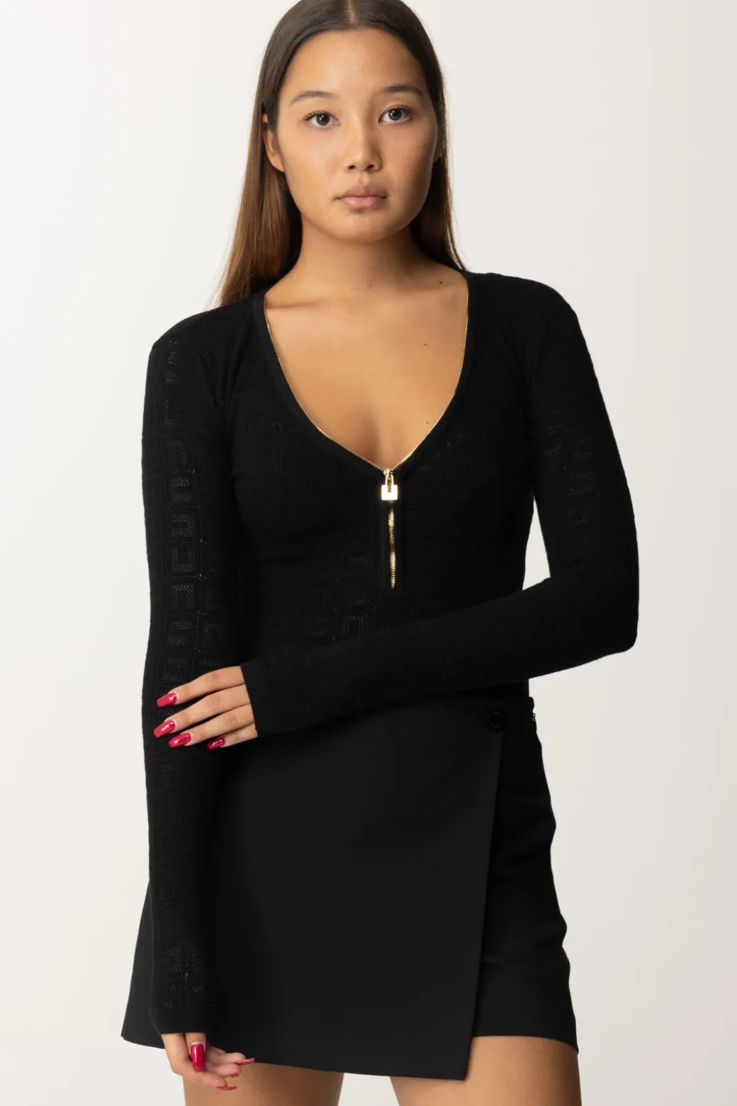 Body Elisabetta Franchi caratterizzato dal punto rete che riproduce il pattern del logo CC all over, per un risultato versatile e attuale. Ben aderente alle forme e sgambato ai fianchi, la scollatura puoi regolarla a piacimento grazie alla zip centrale con tiretto logato. Dai look più casual ai più glamour, mettilo subito alla prova per la stagione!