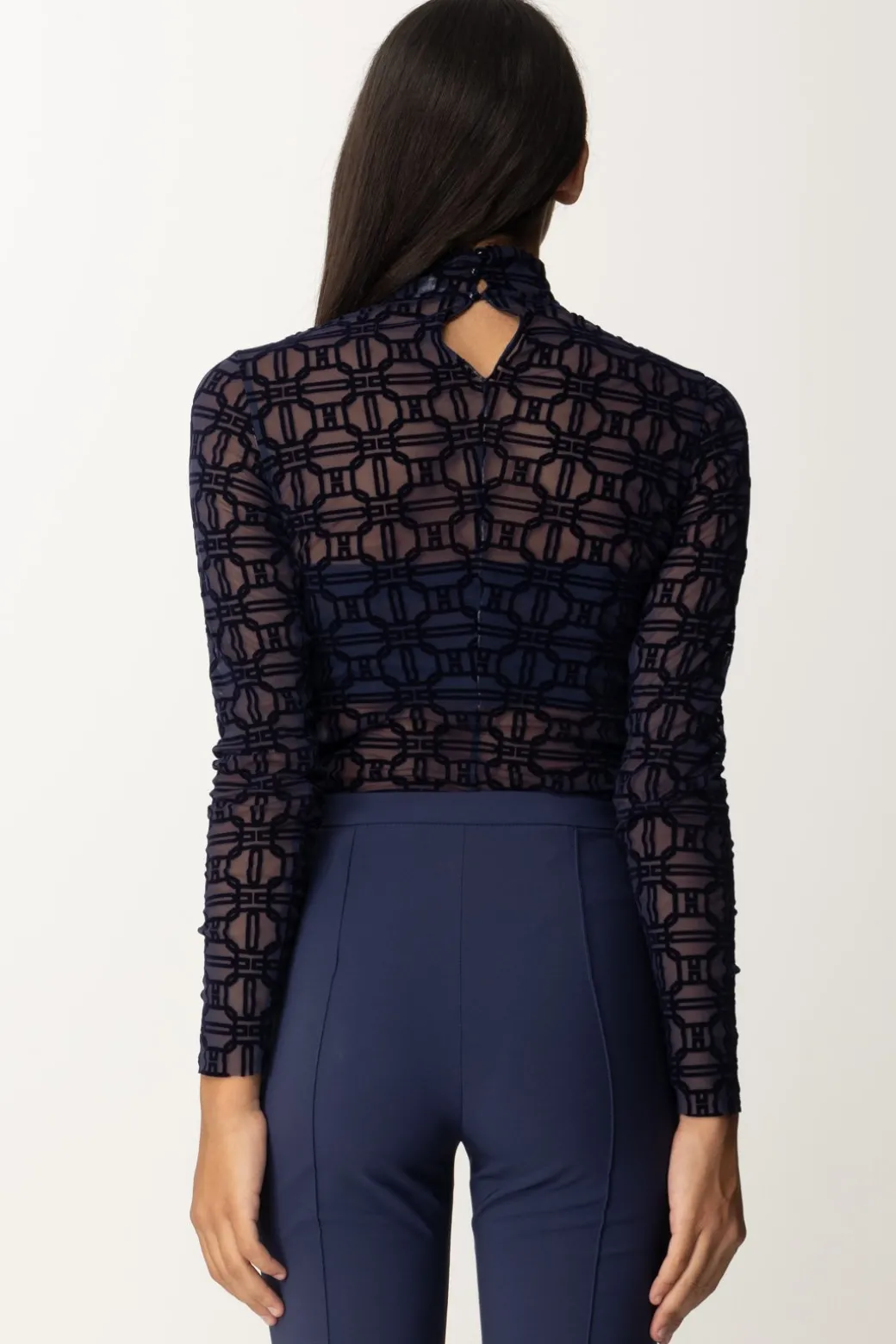 L’effetto see-through di questo body Elisabetta Franchi in tulle si combina con la stampa flock all-over per darti un top sexy e di classe al tempo stesso. Perfetto da indossare come top in combinazione a bottom con la stessa caratteristica, ma anche per rendere più glamour i tuoi denim e più femminili i tuoi outfit formali. Maniche unghe e collo alto, piccolo scollo a goccia sul retro.