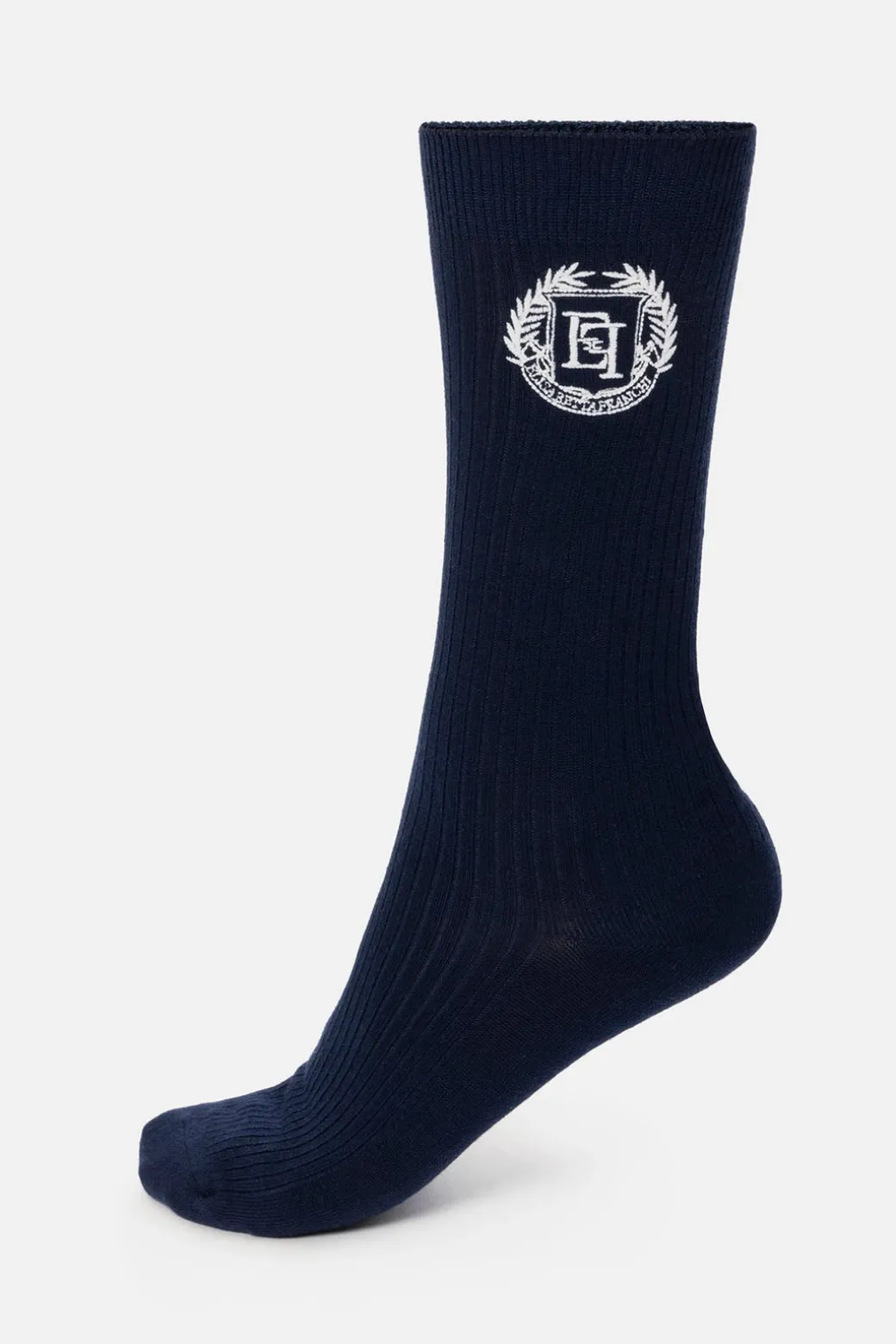 Calzini Elisabetta Franchi realizzati in morbido cashmere a coste e impreziositi da da stemma logo a contrasto di colore. L’accessorio must da abbinare ai tuoi mocassini o sneakers preferite!