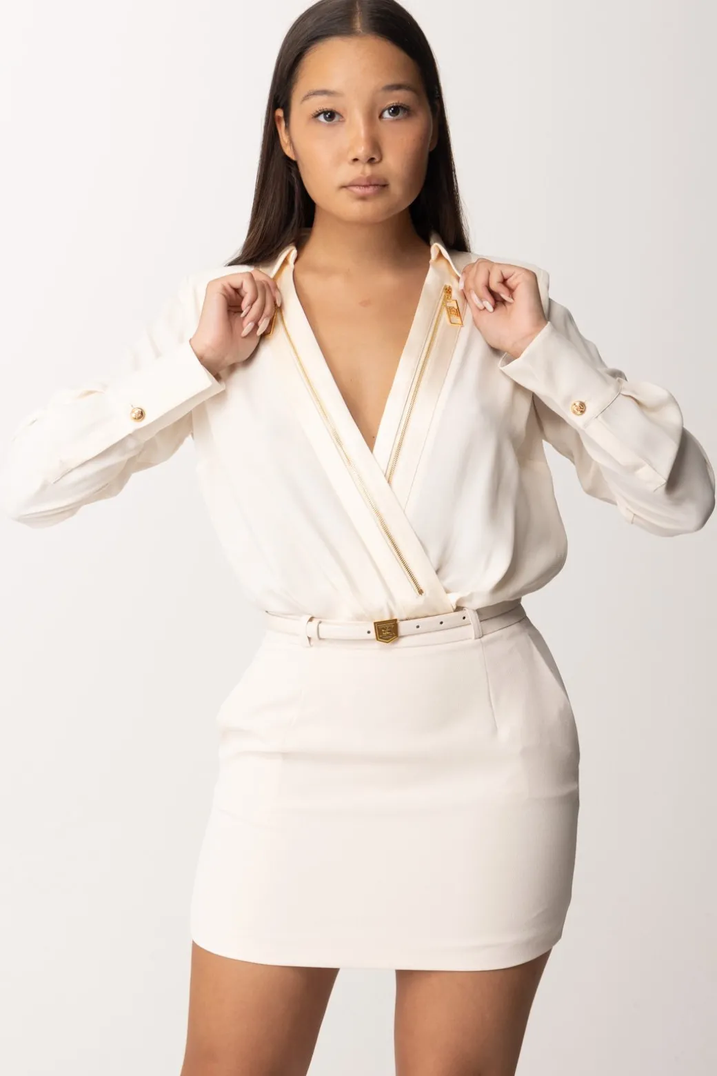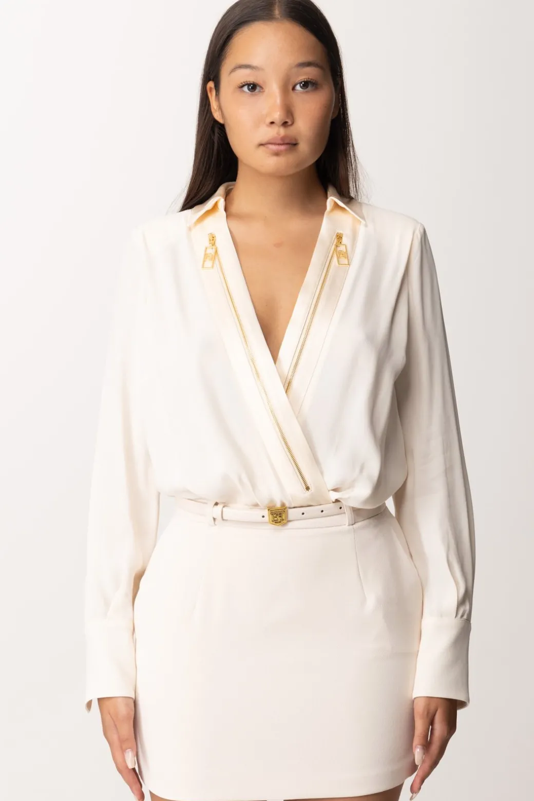 Un classico del tuo guardaroba classy riproposto con un tocco contemporaneo: amerai questacamicia a body Elisabetta Franchi, realizzata in doppia georgette, con il suo scollo a incrocio illuminato dall’applicazione di zip con maxi tiretti logati. Un pezzo che non perde la sua eleganza e versatilità, ma del tutto originale per i tuoi più svariati outfit, dal’ufficio, al tempo libero, all’evento chic.