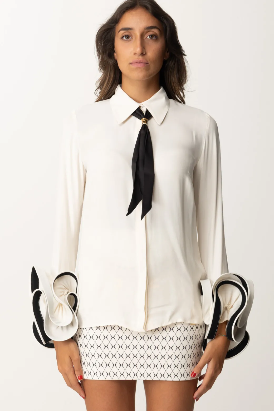 Questa camicia Elisabetta Franchi in georgette conquista con il suo delicato gioco di ruches al fondo, arricchito da un interno a contrasto. Il foulard in twill, impreziosito da un accessorio gioiello dorato, dona un tocco di eleganza sofisticata. Perfetta con una gonna a matita per un look da ufficio elegante, oppure indossala con pantaloni a sigaretta e tacchi per una cena formale.
